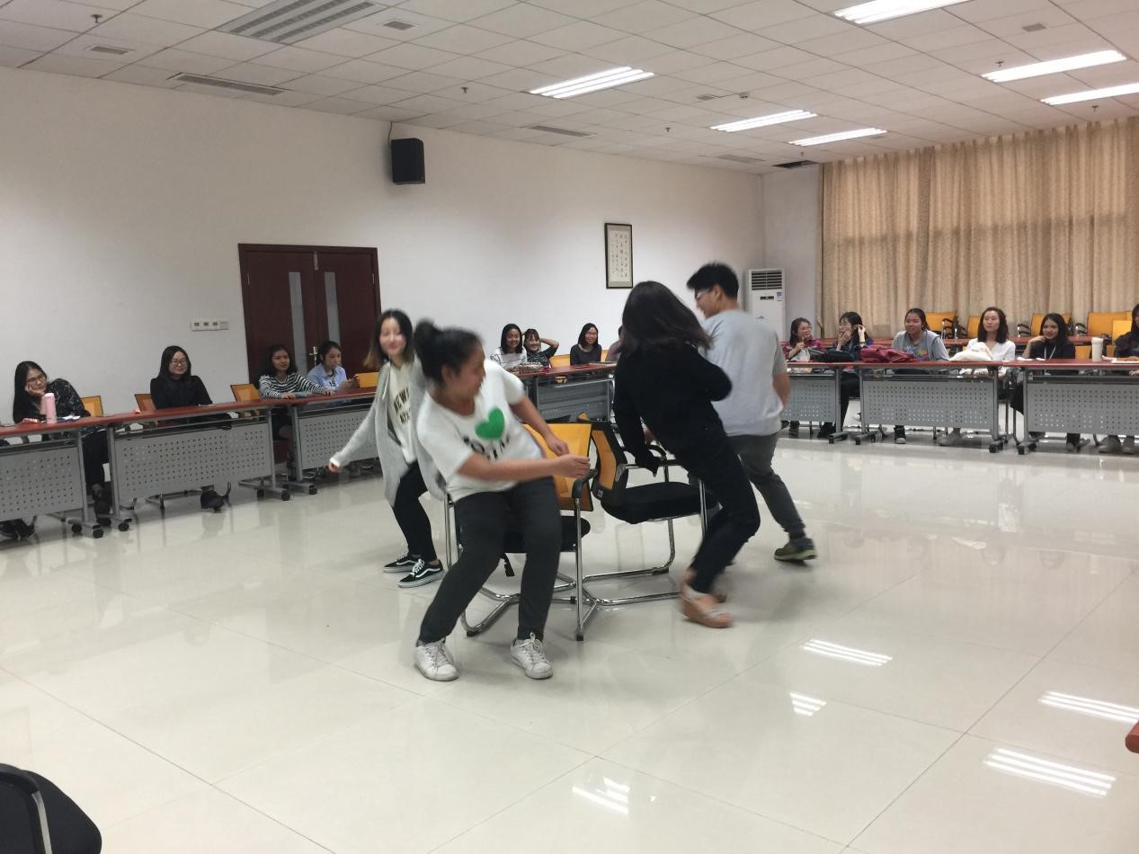 之后同学们一边品尝中秋月饼,一边和语伴互相交流。还在间隙分组进行了知识有奖问答比赛,和玩起了抢凳子的游戏。分组按照中泰学生语伴随机分配,8人一组依次参与,最后再选出优胜组。大家都在竞赛和游戏中拼尽全力,玩得不亦乐乎。