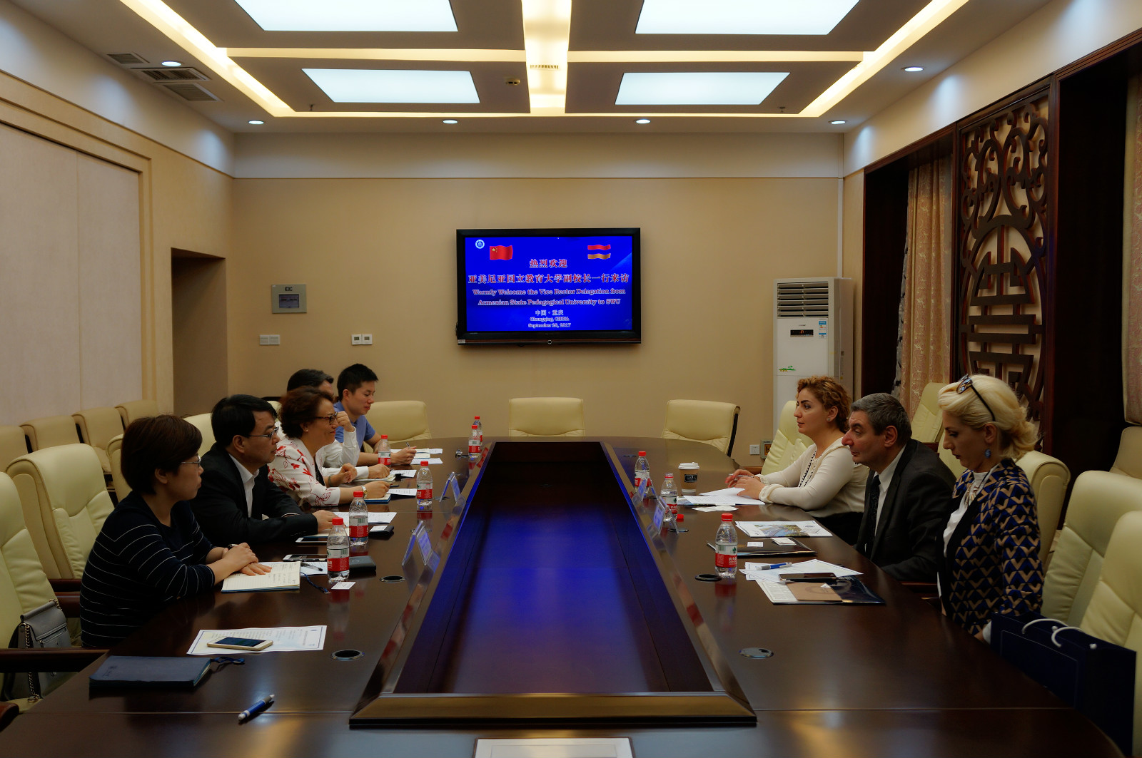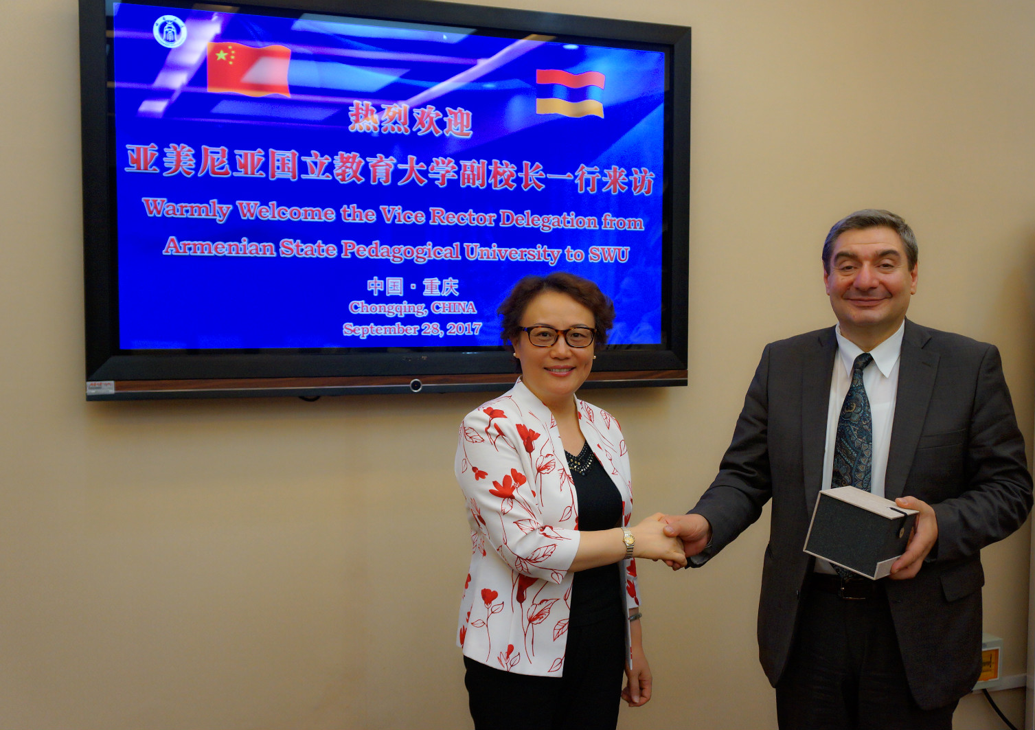2017年9月28日,亚美尼亚国立教育大学副校长阿拉•叶列米扬先生、国际合作部主任克里斯缇娜•萨图尔扬女士等一行两人来院访问,学院院长王静、党总支书记刘猛、招生工作办公室负责人李林泽与学校国际合作与交流处副处长张家政、合作办学管理科科长肖宇等共同会见了客人。