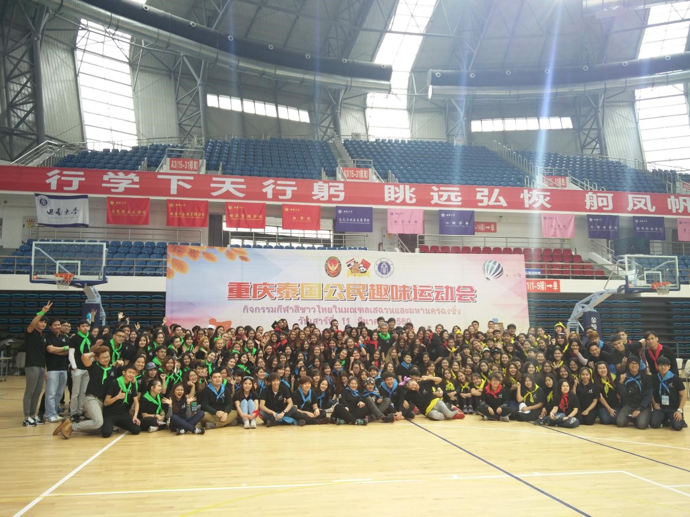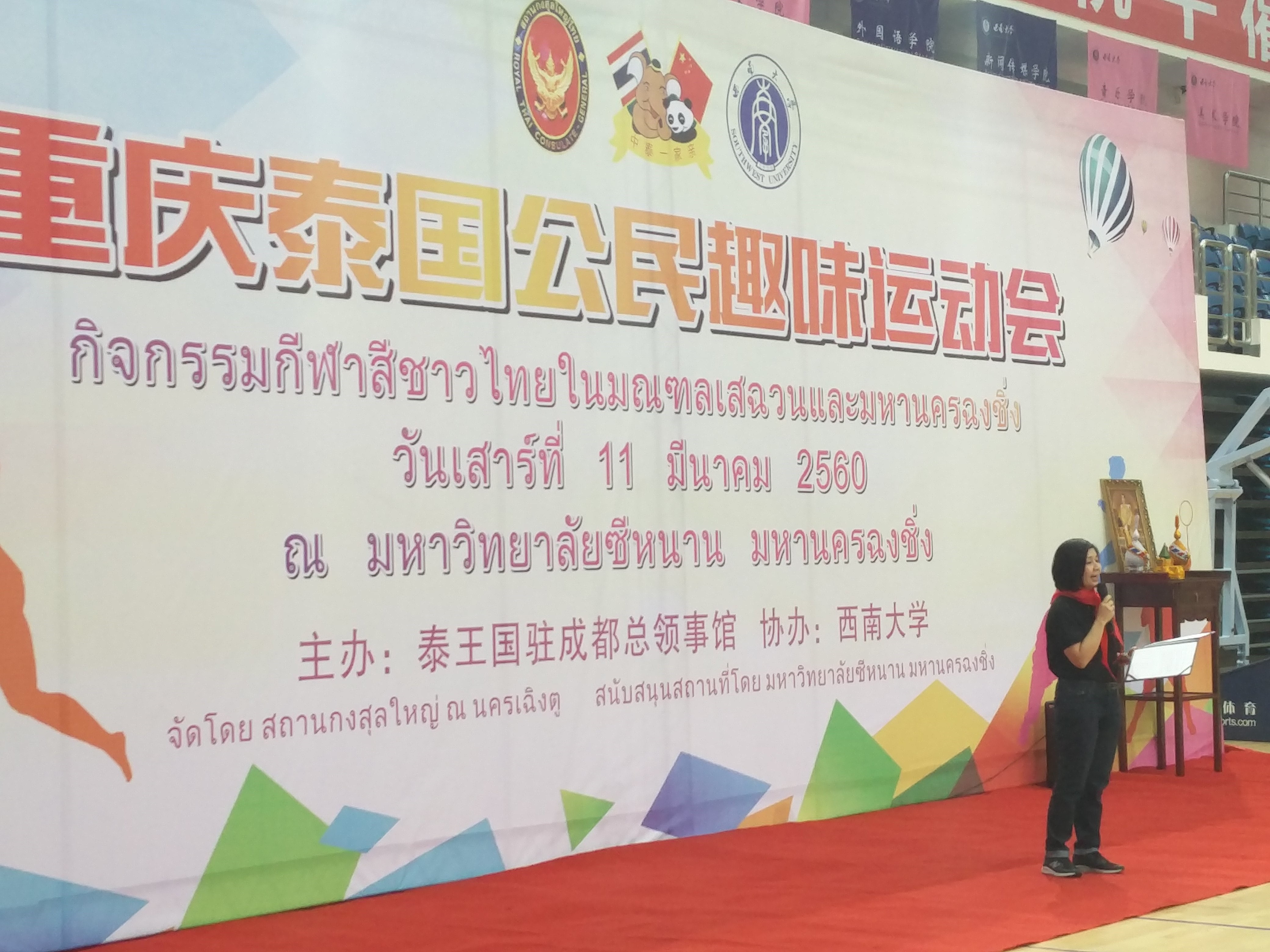 2017年3月11日上午10点,由泰王国驻成都总领事馆主办、西南大学协办的“重庆泰国公民趣味运动会”在学校中心体育馆隆重举行。泰王国驻成都总领事馆总领事潘媞葩、领事巴诺特以及来自重庆6所高校的342名泰国留学生参加此次运动会。