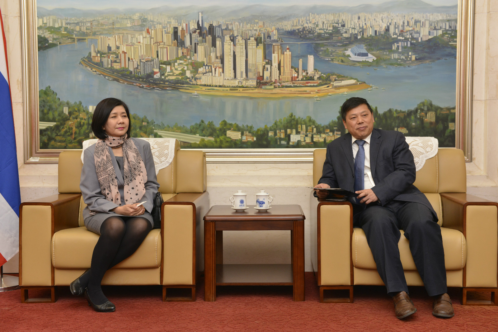 总领事在发言中谈到,虽然她在华任期尚不足一年,但已经是第二次来访,每次来访都得到学校的热情接待,下月她将再次前来参加我校为泰国留学生举行的宋干节庆祝活动。通过两次来访,以及与我校泰国留学生的交流,总领事认为,正是学校优美的学习环境、良好的教学条件、周到的人文关怀、出色的教学和管理等独特魅力,吸引越来越多泰国学生来校留学。总领事说,西南大学已经成为西南地区乃至中国高校中,最吸引泰国留学生的高校。她代表泰国政府和泰国驻成都总领馆,真诚感谢学校对泰国留学生的教育、培养和关爱,希望在人才培养、交流等领域的合作之外,与泰国高校间能进一步提升和加强在科学研究方面的合作,总领馆也将为此不遗余力给予支持和帮助。会见结束时,双方互换了礼物并合影留念。
