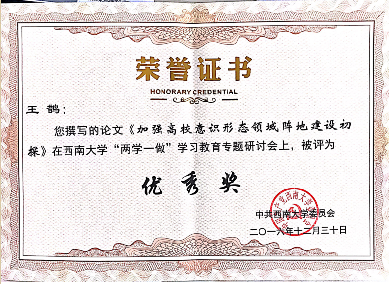我院王鹊老师荣获学校“两学一做”学习教育征文比赛优秀奖
