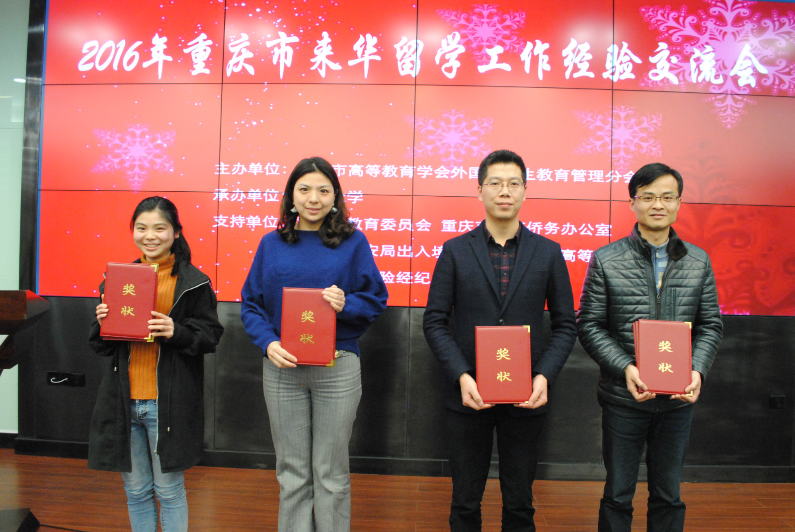 在颁奖环节中,学院荣获高校留管干部业务知识竞赛二等奖以及优秀组织奖。代远鸿、陈雨曦、陈钊、邹育艳四位老师获得2016年度重庆市来华留学先进个人荣誉称号。