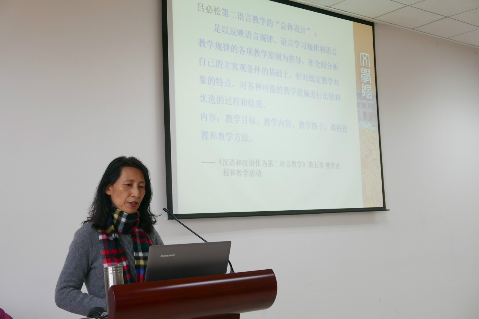 孙琳老师主要从宏观和微观两个方面解释说明了教学设计在对外汉语教学中的应用。宏观上,孙琳老师结合教育学者的观点,从“过程规划说、方法说以及技术说”三个不同的角度解释说明了教学设计的内涵;并通过对教学设计的定义说明强调对外汉语教学中的总体设计的重要性。微观上,孙琳老师结合“初级口语课设计案例”和“中级综合课设计案例”两个具体的对外汉语教学案例,分析教学设计在不同课程中的要求和规范。她认为合理的教学设计使教学目标明确,突出教学重难点,帮助教师把握教学步骤。除此以外,孙琳老师还从“词语展示的方法、课堂提问设计和课堂临时问题的处理”三个方面来分析解释了教学细节的设计。