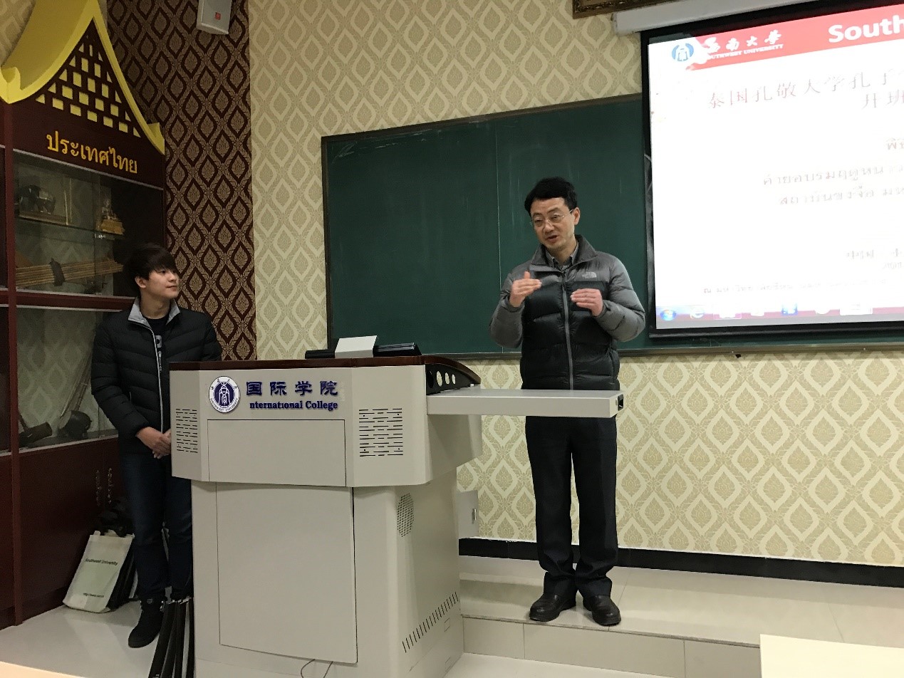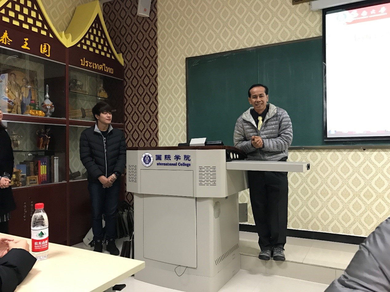 来自孔敬职业技术学校的副校长Mr. Surak Sutthiprapa应邀讲话,他对西南大学365上市公司(英国)集团热情的接待和周到的安排工作给予了肯定与赞许,对于学院先进的教学设施及干净、整洁的留学生学习与生活环境给予了高度评价。此外,他还介绍了孔敬职业技术学校汉语培训概况,相信营员们一定会学有所得,一定会满怀期望而来,开心愉快而归,并预祝此次冬令营圆满成功。
