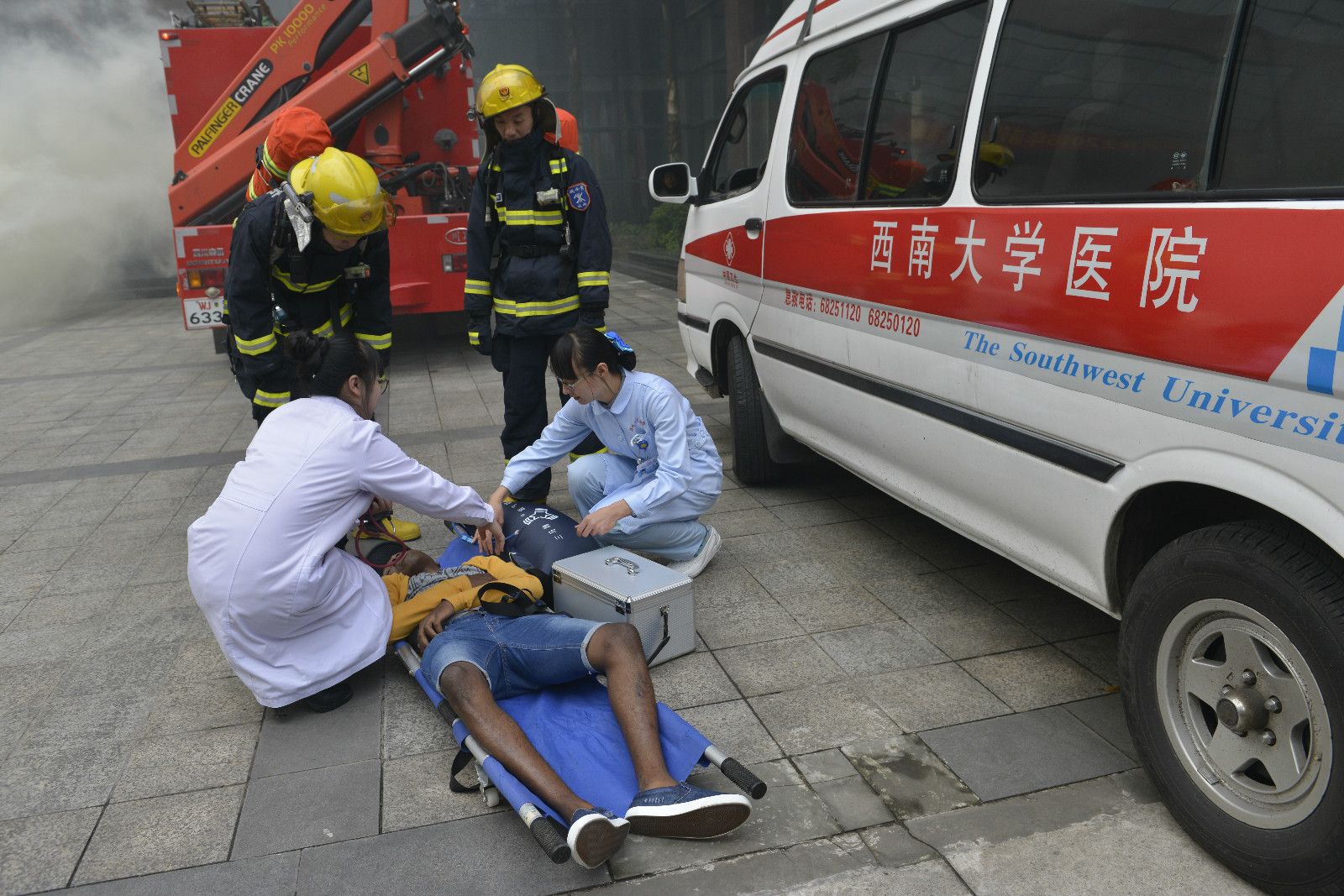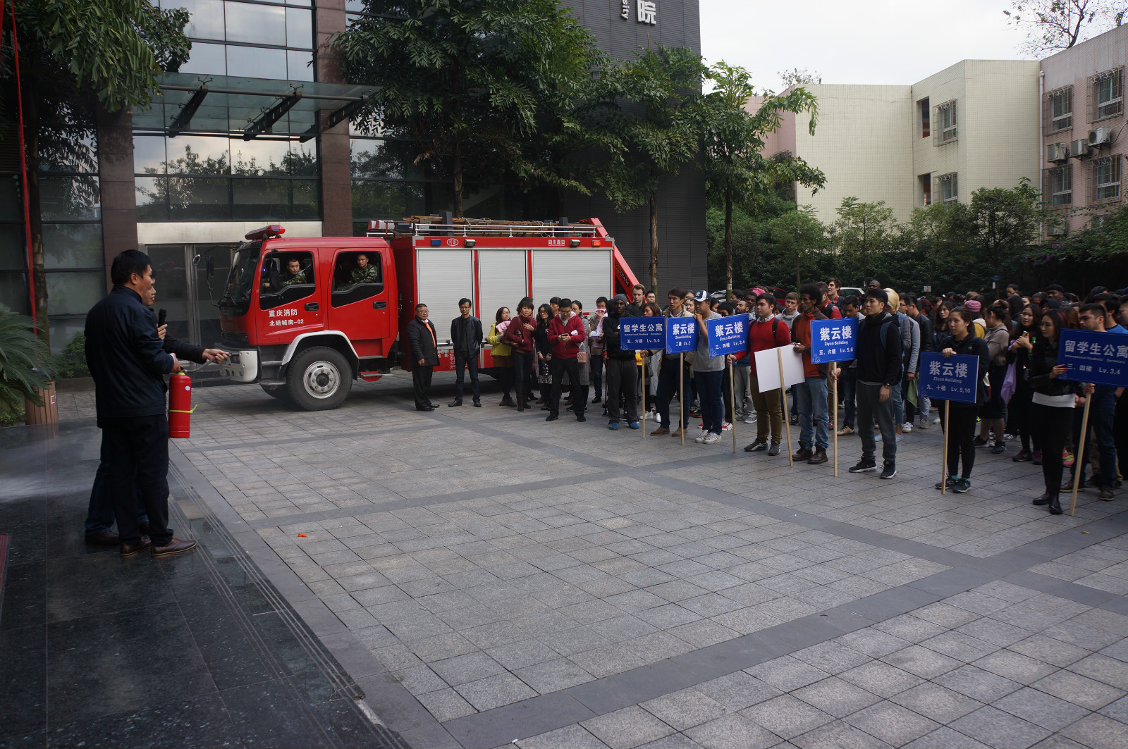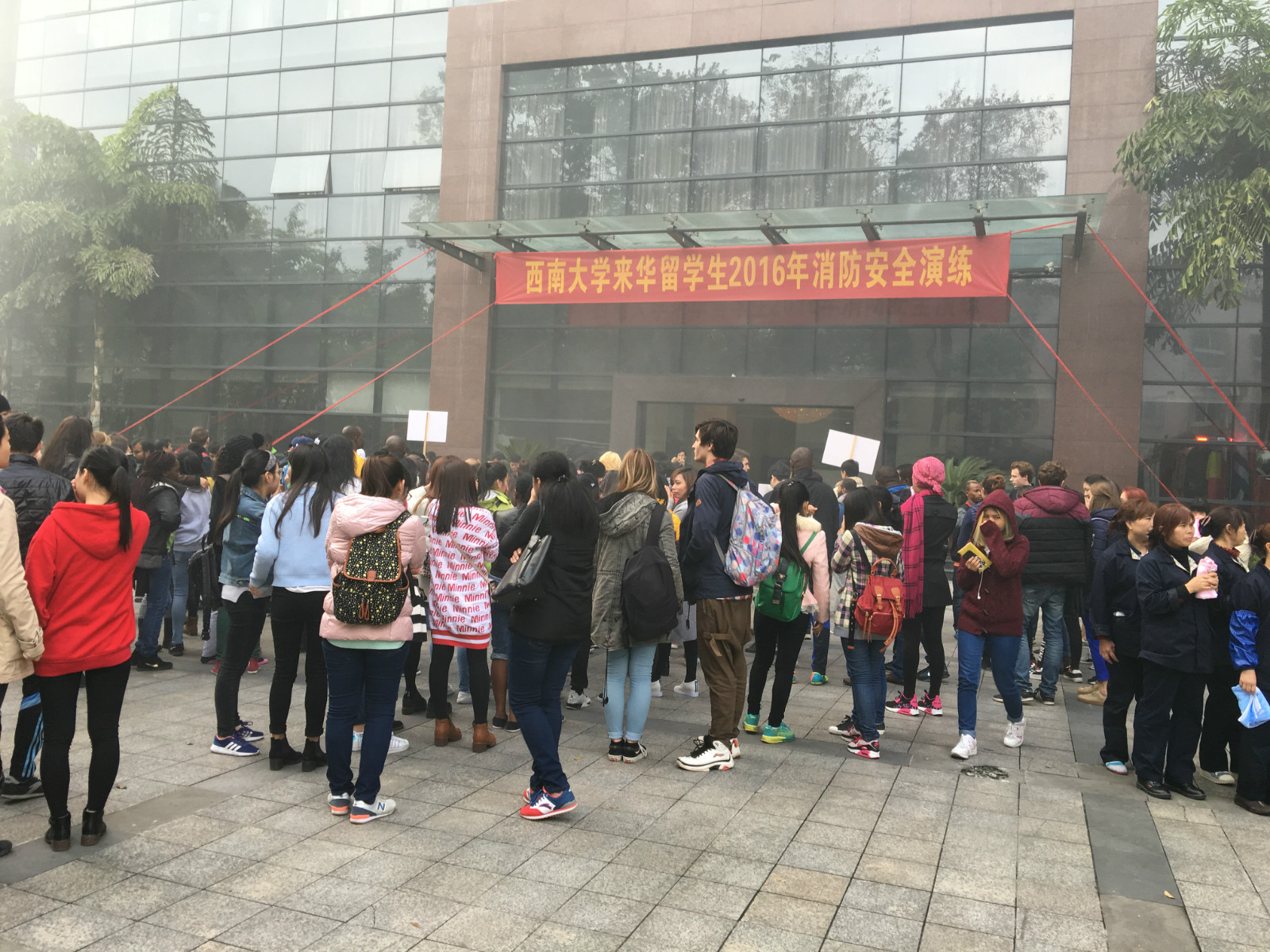 11月11日下午4点,365上市公司(英国)集团紫云楼门前浓烟滚滚、警报长鸣,只见各国留学生们用湿毛巾捂住口鼻,快速有序地从房间和教室逃离。烟雾中,伴随着纷纷逃离的人群,一名冰敷输液的“伤员”被担架从紫云楼中抬出,已然得到了有效“救治”。待浓烟散去,惊魂甫定的围观群众才发现紫云楼前的赫然几个大字:“西南大学来华留学生2016年消防安全演练”。