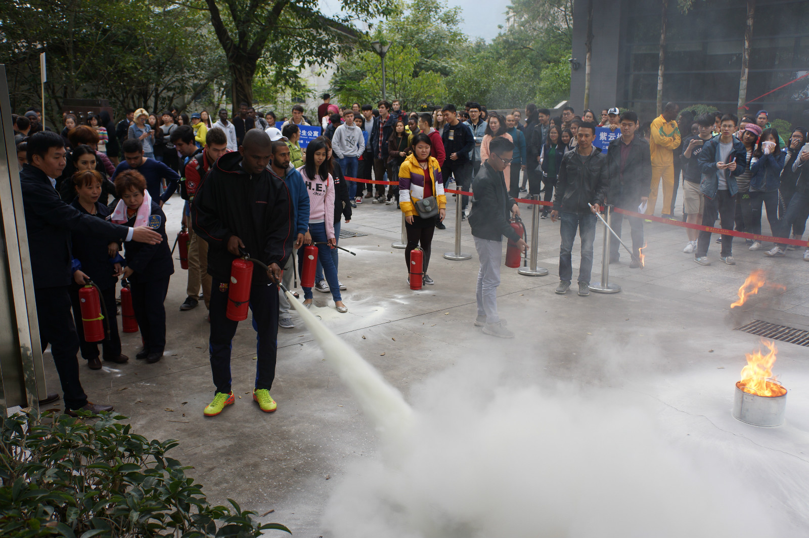 消防安全演练结束后,学校保卫处消防办郭勇主任还向留学生们现场讲解了如何使用消防灭火器,留学生们纷纷自告奋勇,上前体验灭火器的正确使用方法,增加了对消防器材的直观了解。