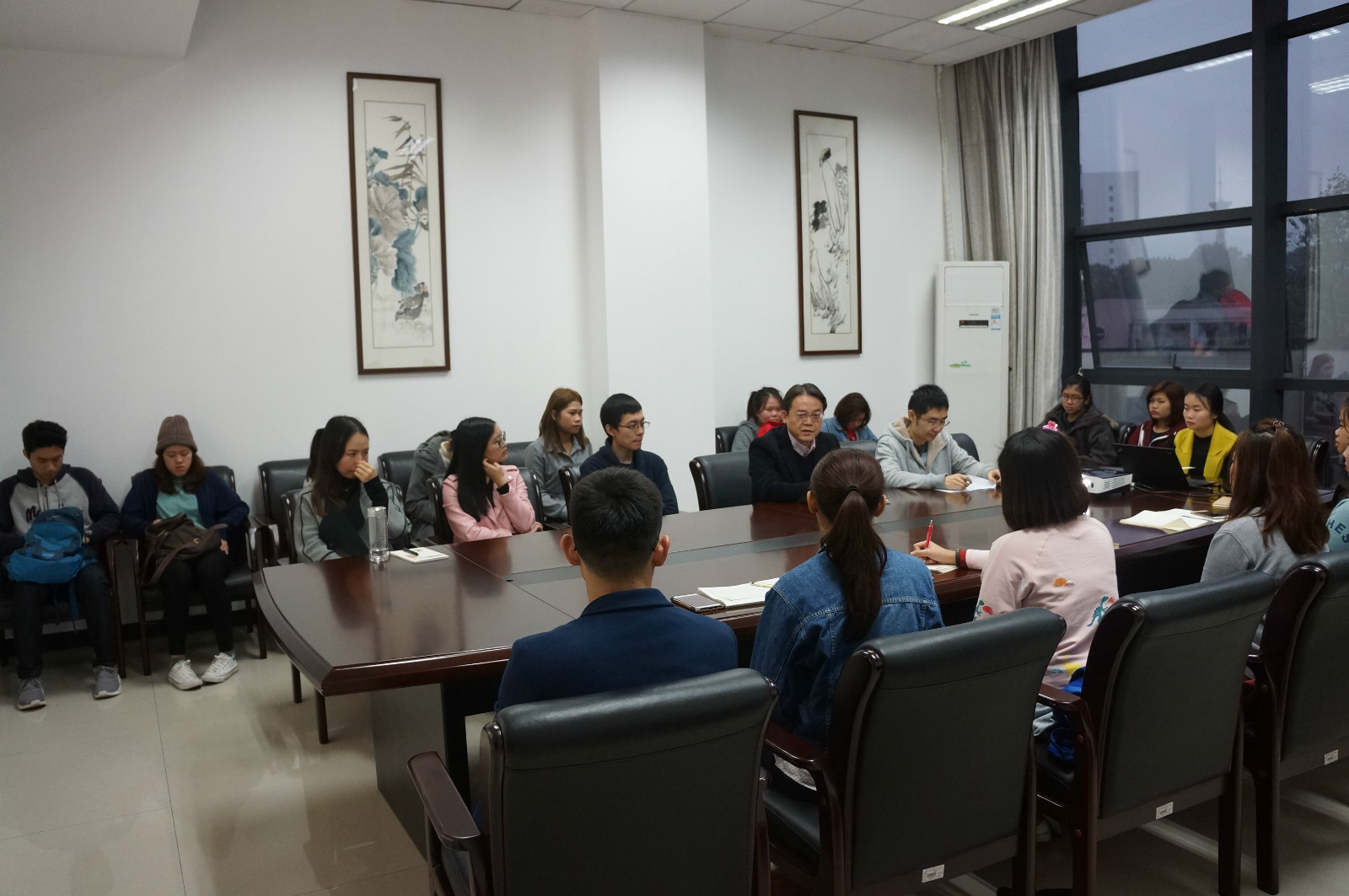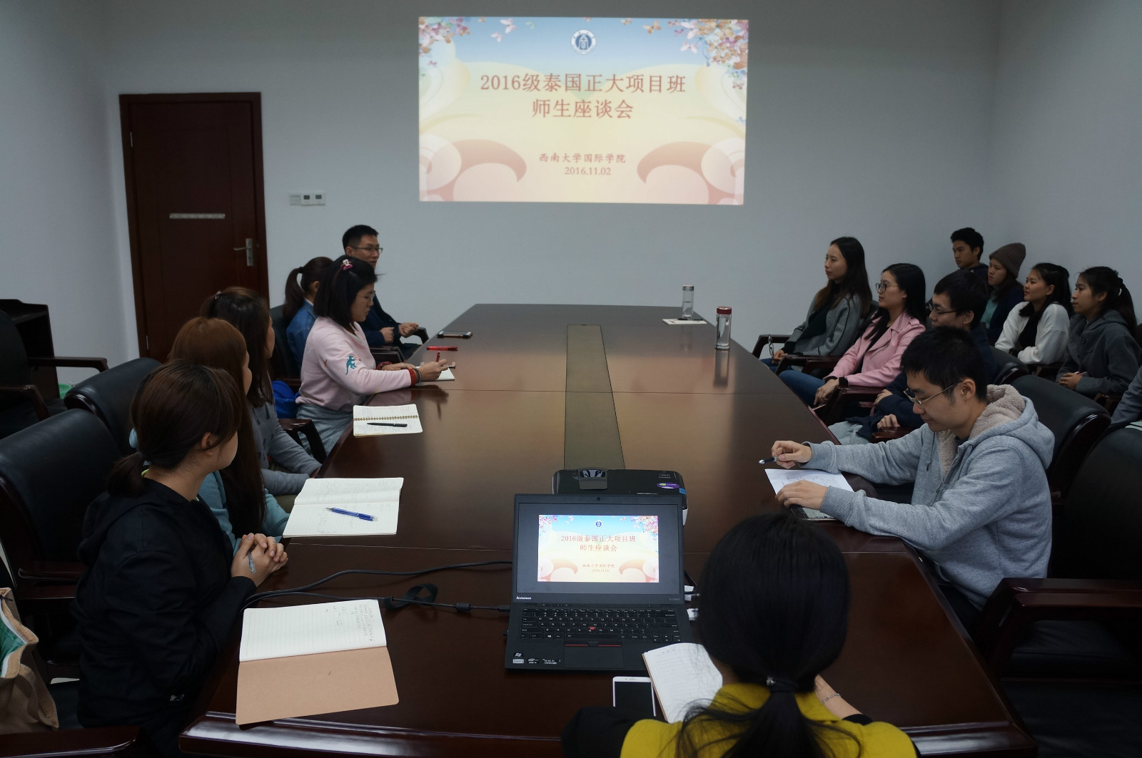 2016年11月2日下午4点半,2016级泰国正大管理学院"1+1+2"商务汉语本科项目班师生座谈会在紫云楼304会议室举行。学院刘猛书记,学工办王湛明、任课教师代表以及20名泰国学生参加座谈。