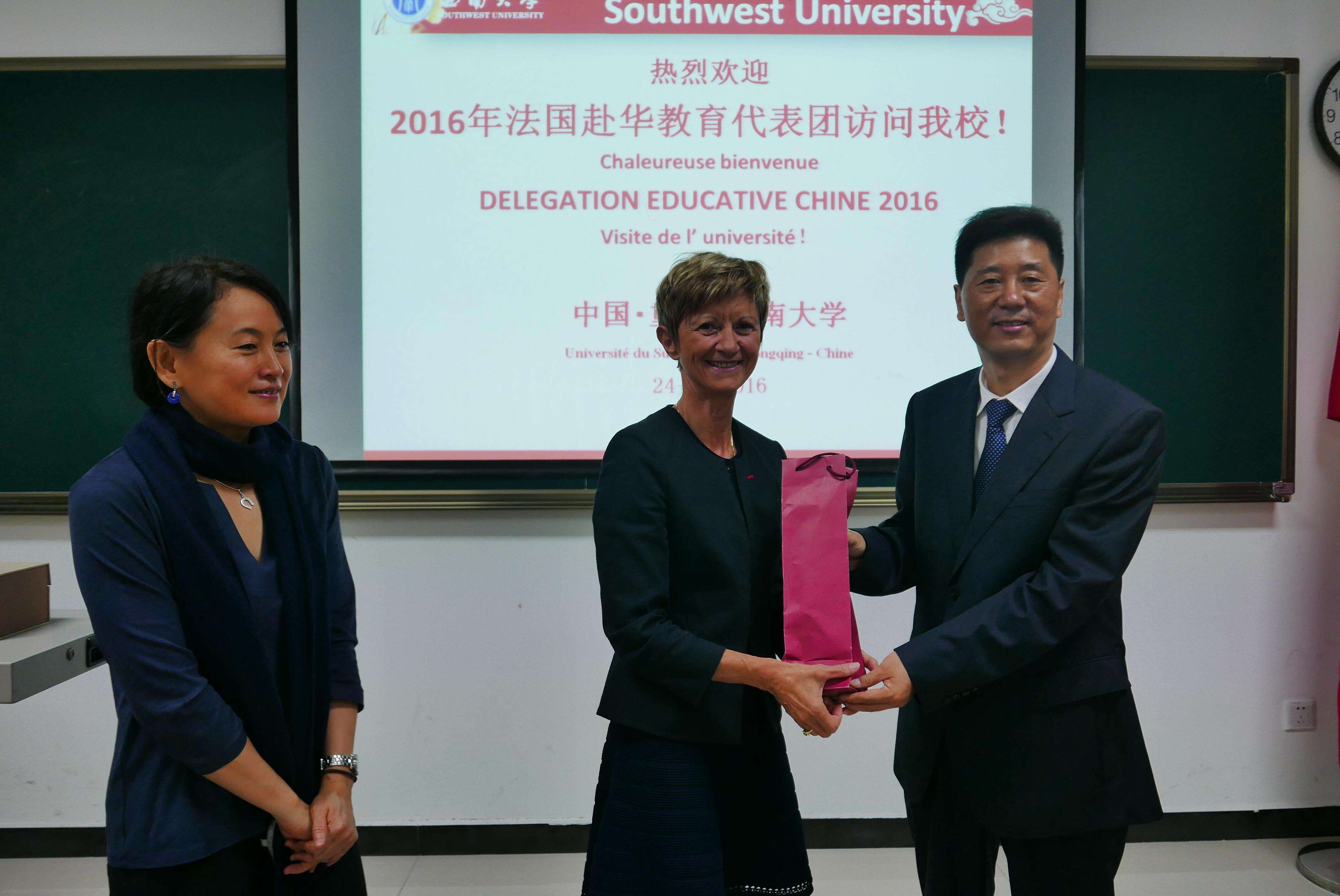 靳玉乐副校长与全体团员亲切合影,并在随后举行的欢迎仪式上致辞,欢迎来自法国各地的学区长和中学校长到访我校。他详细介绍了重庆和学校的基本情况,希望代表团成员在重庆期间深入了解重庆经济社会文化发展,了解中国基础教育发展现状,了解西南大学,寻找合作契机。