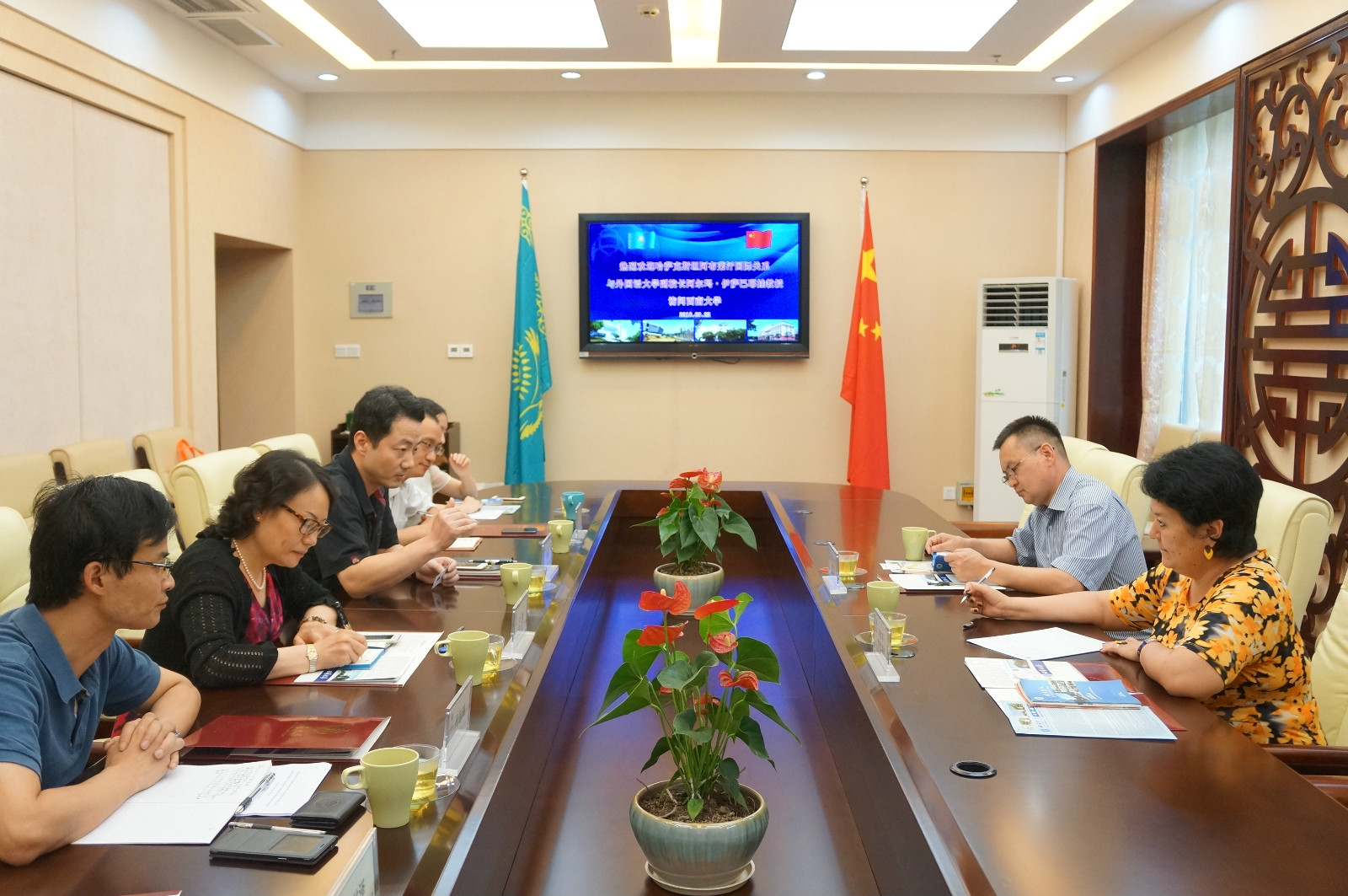 双方首先就两校共同申报阿布莱汗大学孔子学院工作进行了回顾,对孔院建设充满信心。随后,李航副院长详细介绍了我院工作内容和招生政策。最后,双方就“1+3”或“2+2”方式共同培养阿布莱汗大学汉语专业本科学生、长短期交换生、汉硕实习等项目深入探讨,商定合作时间表。