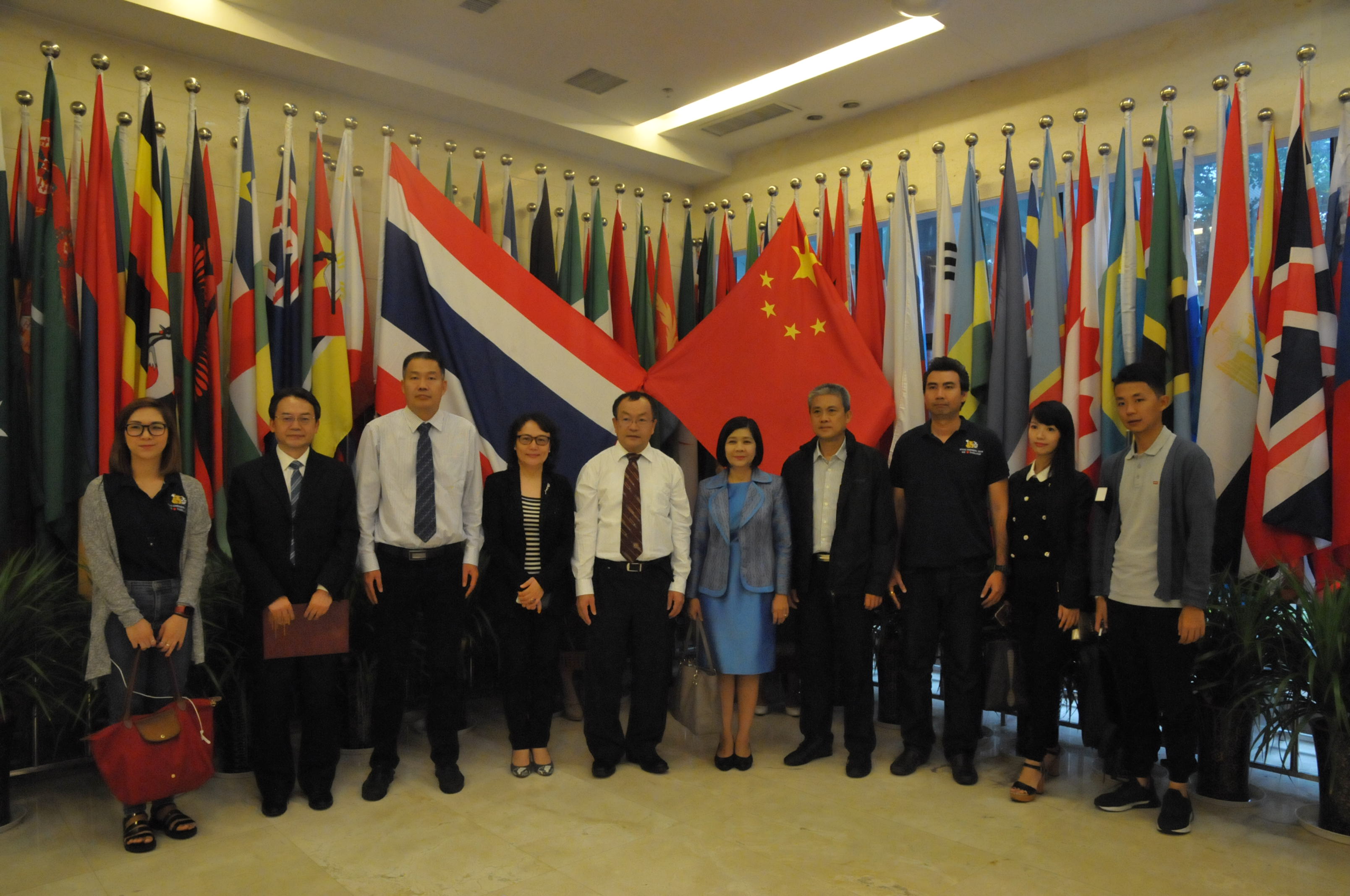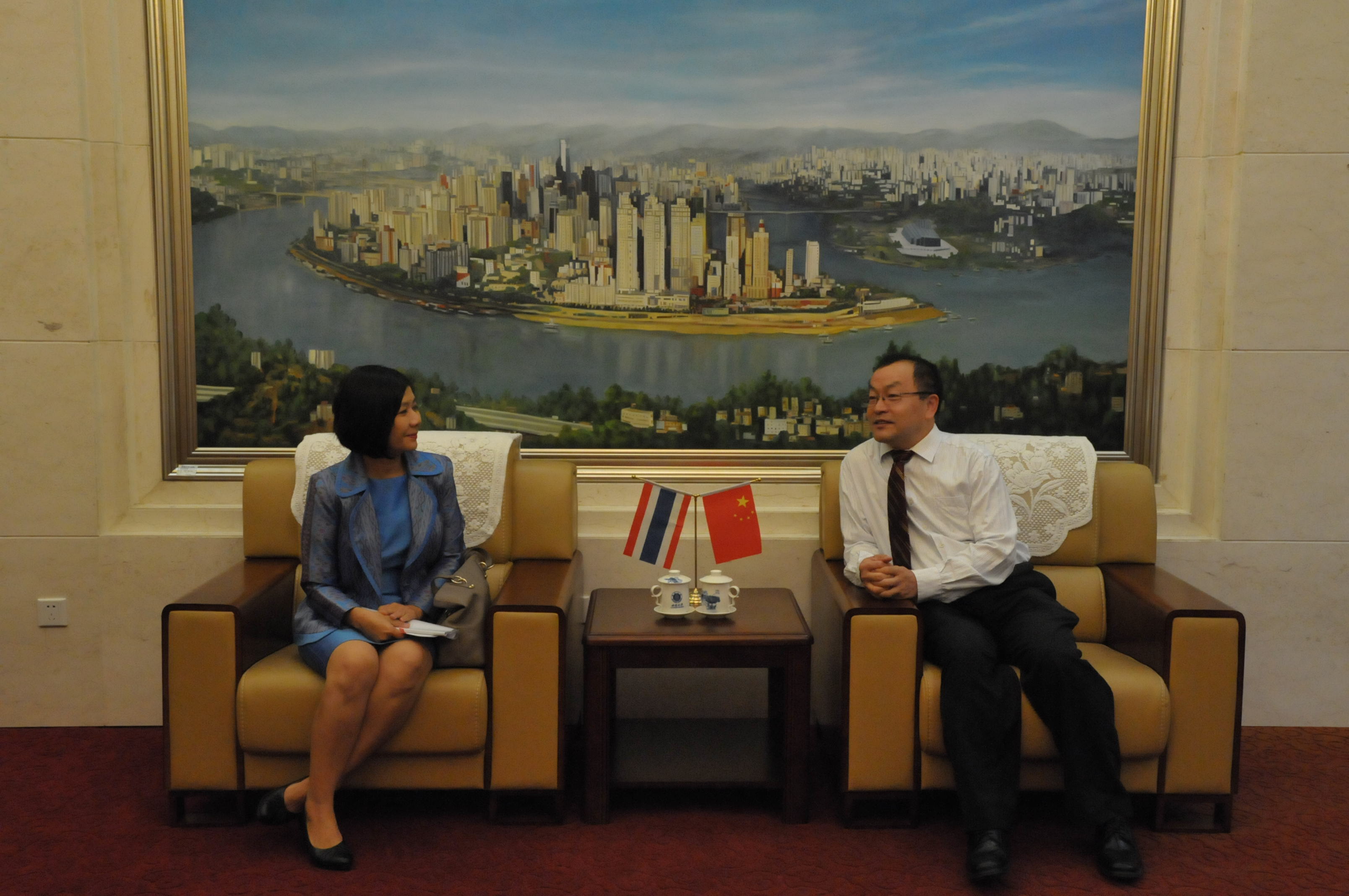 副校长丁忠民在紫云楼会见潘媞葩总领事一行。丁校长简要介绍了学校和来华留学生的概况,潘媞葩总领事对学校给予泰国留学生的关心与照顾表示衷心的感谢,双方在友好的氛围下互赠礼物。