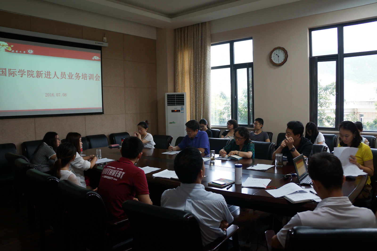 上午的培训会由李航副院长主持,各部门负责人做专题培训。招生办主任代远鸿从工作内容、人员分工、工作流程三个方面介绍招办工作。外事服务中心负责人何汉儒介绍了学院后勤保障、留学生大楼的日常管理、设备维护、消防安全等,强调了节约意识和安全意识。汉教系主任耿军对学院教学科研情况、教师管理要求以及考核奖惩措施等方面进行了详细的说明。学生工作办公室李林泽从学工办定位、业务范围、业务素养、纪律要求、新员工建议等几个方面作了全面细致的说明。综合办公室主任邹育艳就办公室工作职责、学院规章制度、外事纪律等方面进行了阐释,强调外事无小事,凡事多请示。