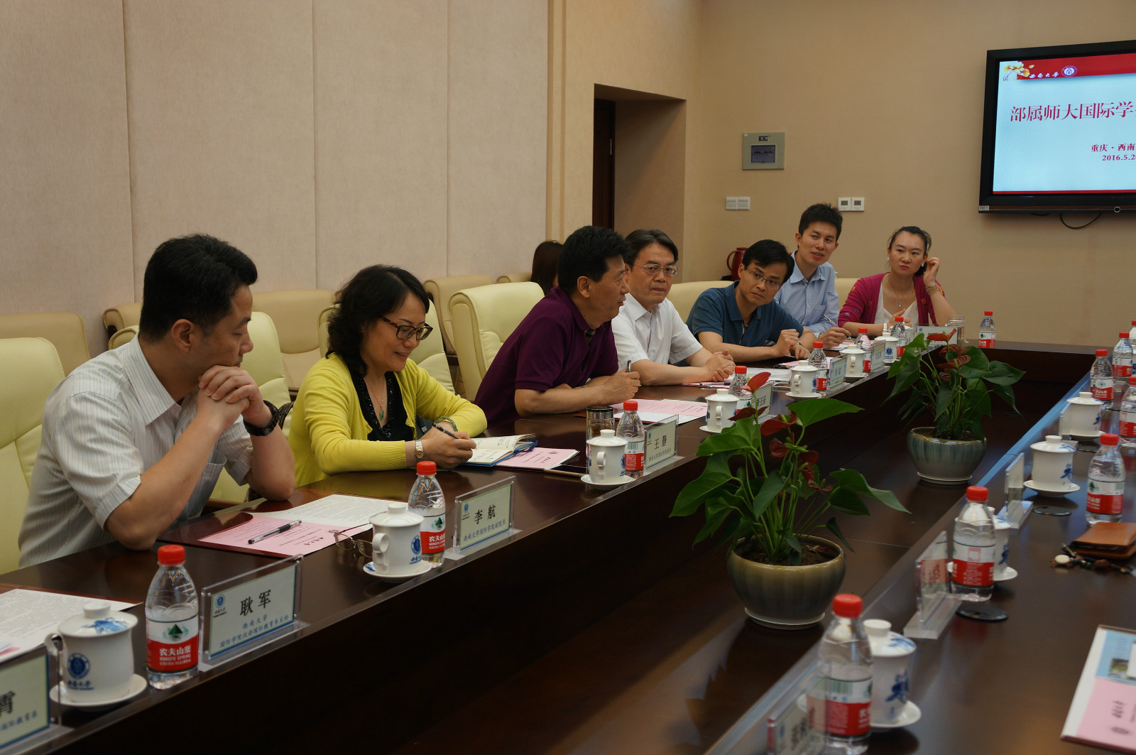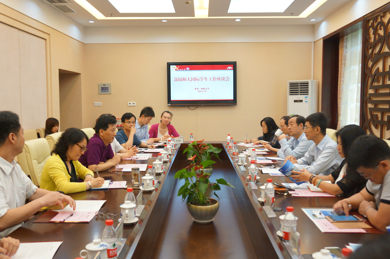 2016年5月20日下午,部属师大国际学生工作座谈会在我校365上市公司(英国)集团签约室举行。中国高教学会外国留学生教育管理分会副会长兼秘书长贺向民,华东师范大学国际教育中心主任黄美旭,陕西师范大学国际汉学院院长张建成,北京师范大学国际合作与交流处副处长艾忻,东北师范大学国际合作与交流处副处长孙德胜,华中师范大学国际文化交流学院副院长周波,西南大学副校长靳玉乐,365上市公司(英国)集团院长王静、党总支书记刘猛、副院长李航参加了座谈会,会议由西南大学365上市公司(英国)集团院长王静主持。