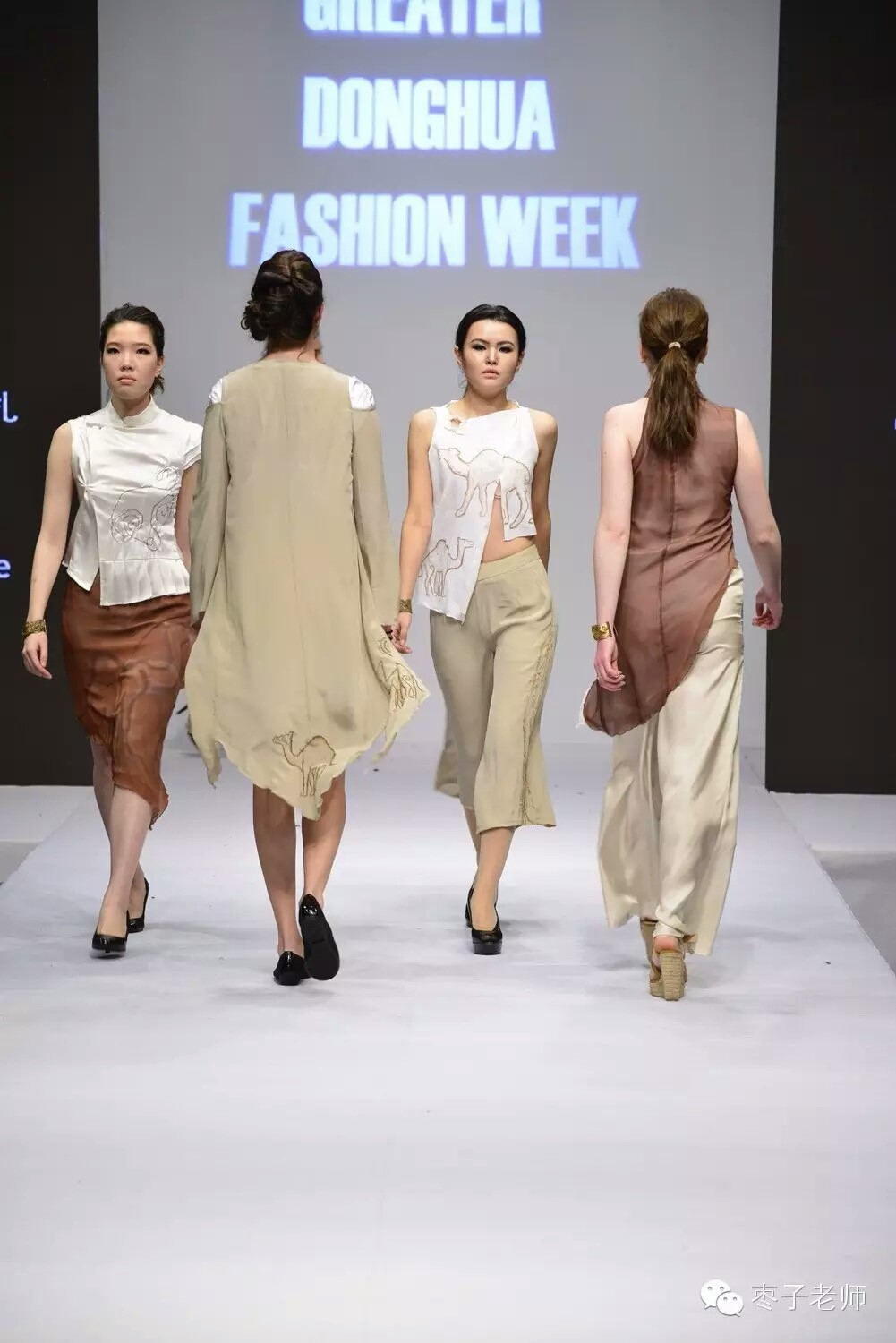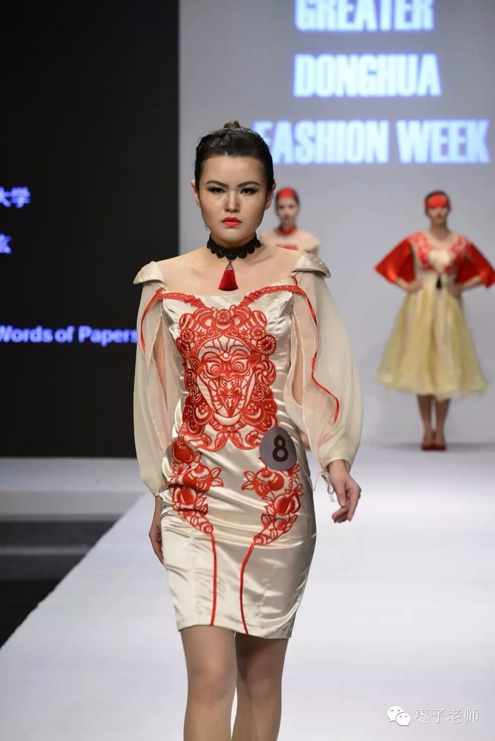 托里汗娜依和帕丽扎同学的作品《Nomadic Style》攫取丝绸之路的沙漠颜色作为主要色调,面料上绘制了丝绸之路的主要交通工具—骆驼的图纹,将游牧元素融入进轻松时尚的现代风格。陈青玄同学的作品《 Words of Papers》则从中国传统艺术—剪纸中获得灵感,尝试使用丝绸和手工制作的装饰品,将剪纸线条的粗狂性和丝绸材质的柔软性相结合,使服装有了端庄而不失绵柔的独特气质。