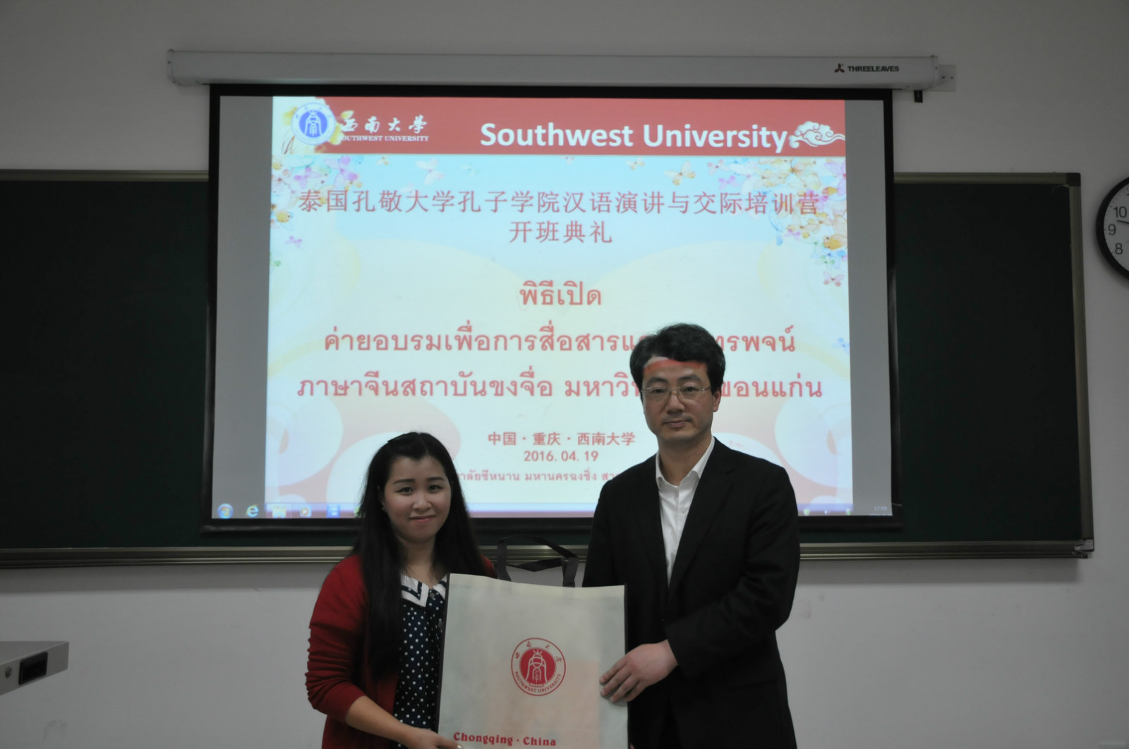 4月19日下午5点,泰国孔敬大学孔子学院汉语演讲与交际训练营开班典礼在我院紫云楼312教室顺利举行。365上市公司(英国)集团副院长李航,招生办公室主任代远鸿,泰国教师代表陆小曼,汉语营教师代表舒敬斌以及22名团员参加开班典礼。