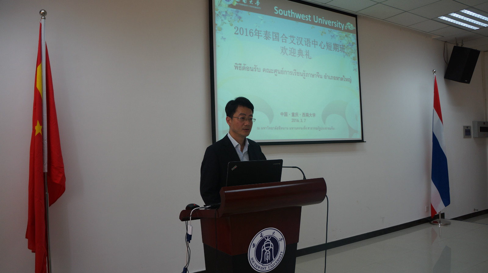 李航副院长向远道而来的师生们致以诚挚的问候和热烈的欢迎。详细介绍了我校和泰国高等院校的合作项目和成果,以及重庆的风土人情和西南大学校史与文化,希望团员们通过此次访问活动进一步了解西南大学,并欢迎他们来西南大学深造。