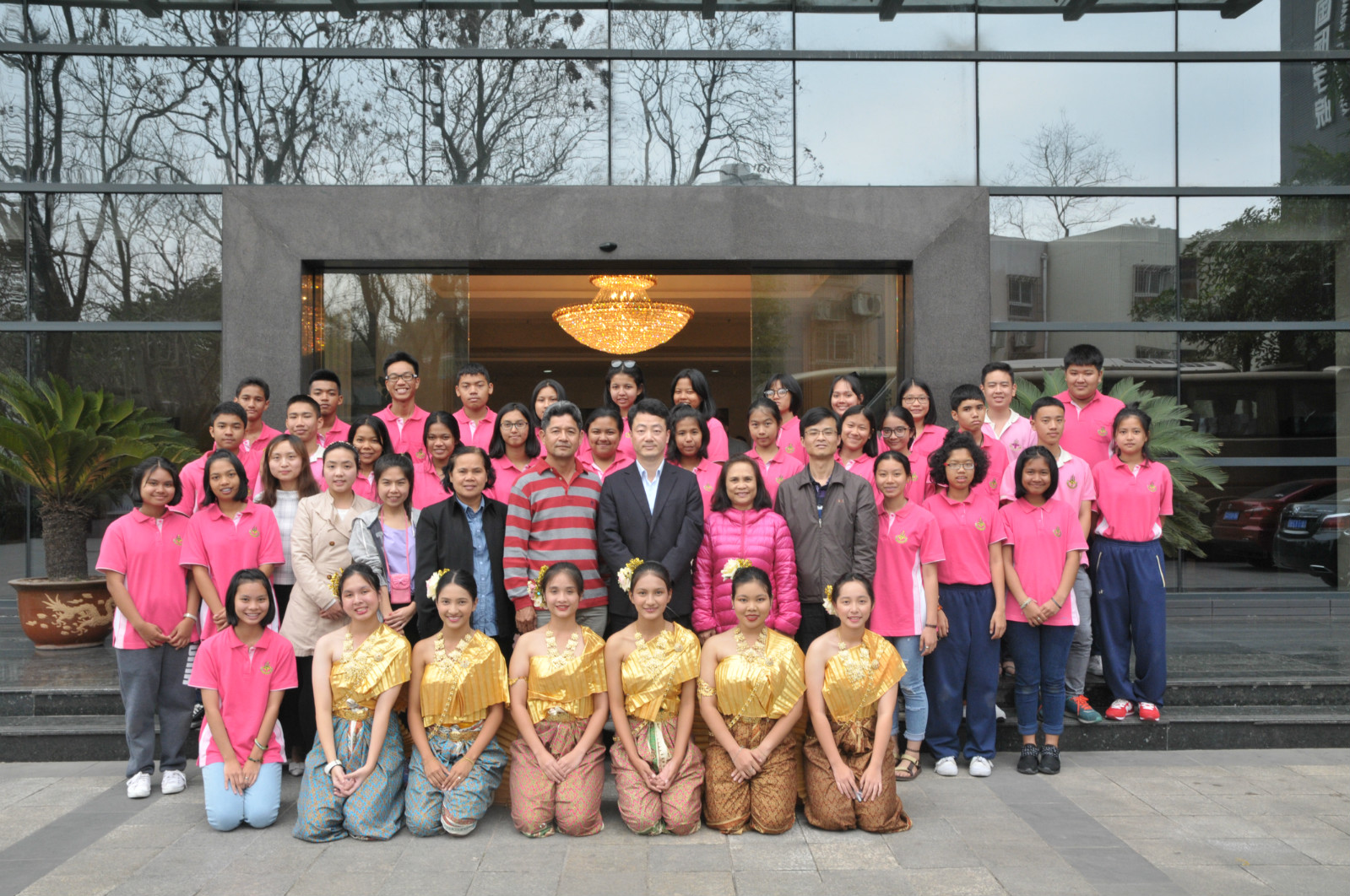 李航副院长向泰国教师代表赠送纪念品,6名泰国学生表演了泰国传统风情舞蹈,典礼在愉悦的氛围中结束。会后大家在紫云楼前合影留念,泰国团员们在语伴的陪同下乘观光车参观了校园。