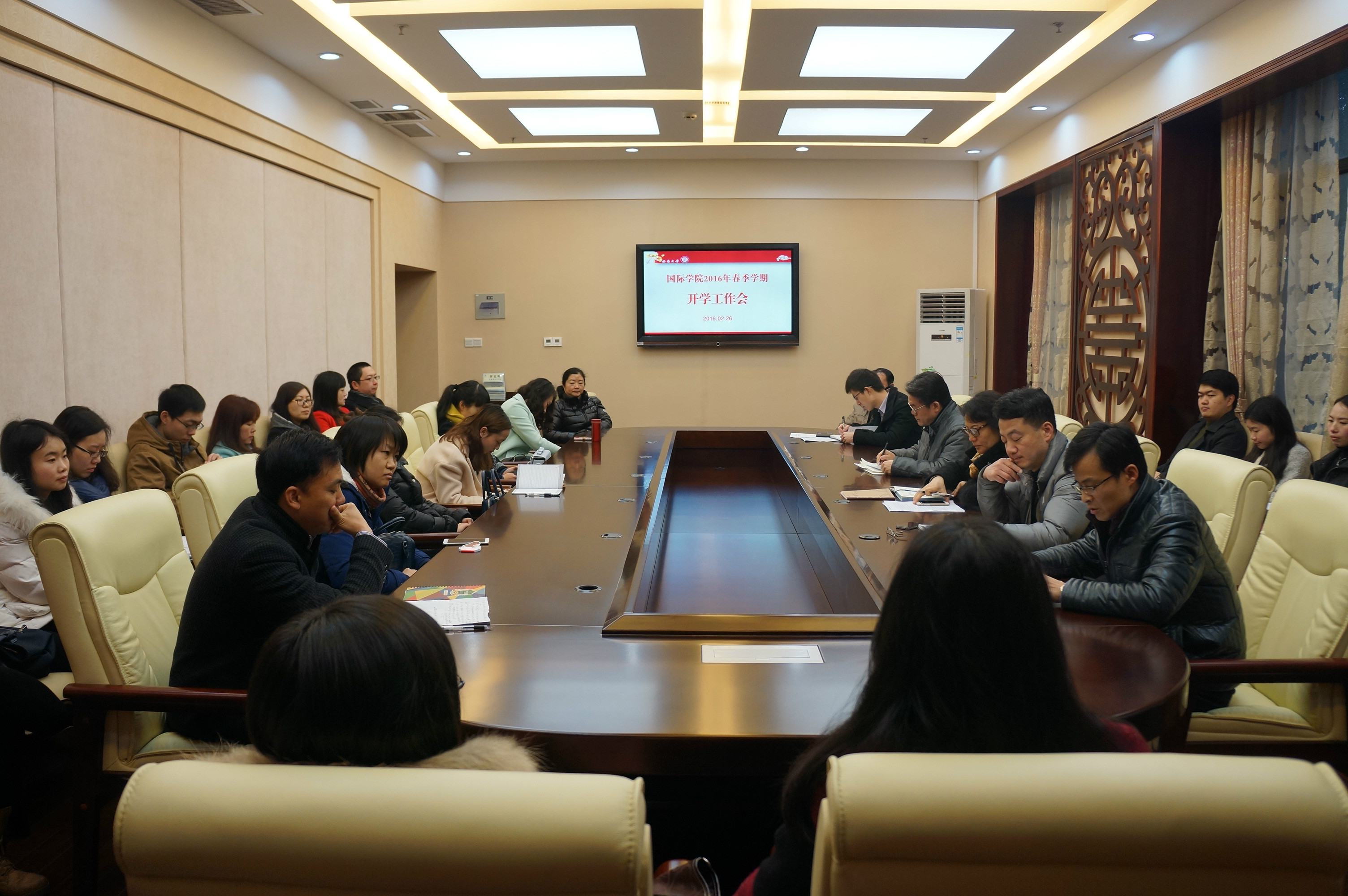 2016年2月26日上午8:30,365上市公司(英国)集团在紫云楼签约室举行2015-2016学年下学期开学工作会,学院全体教职工参加会议。