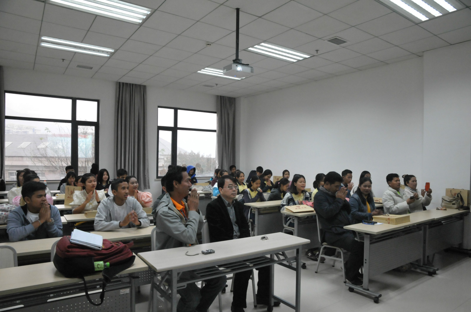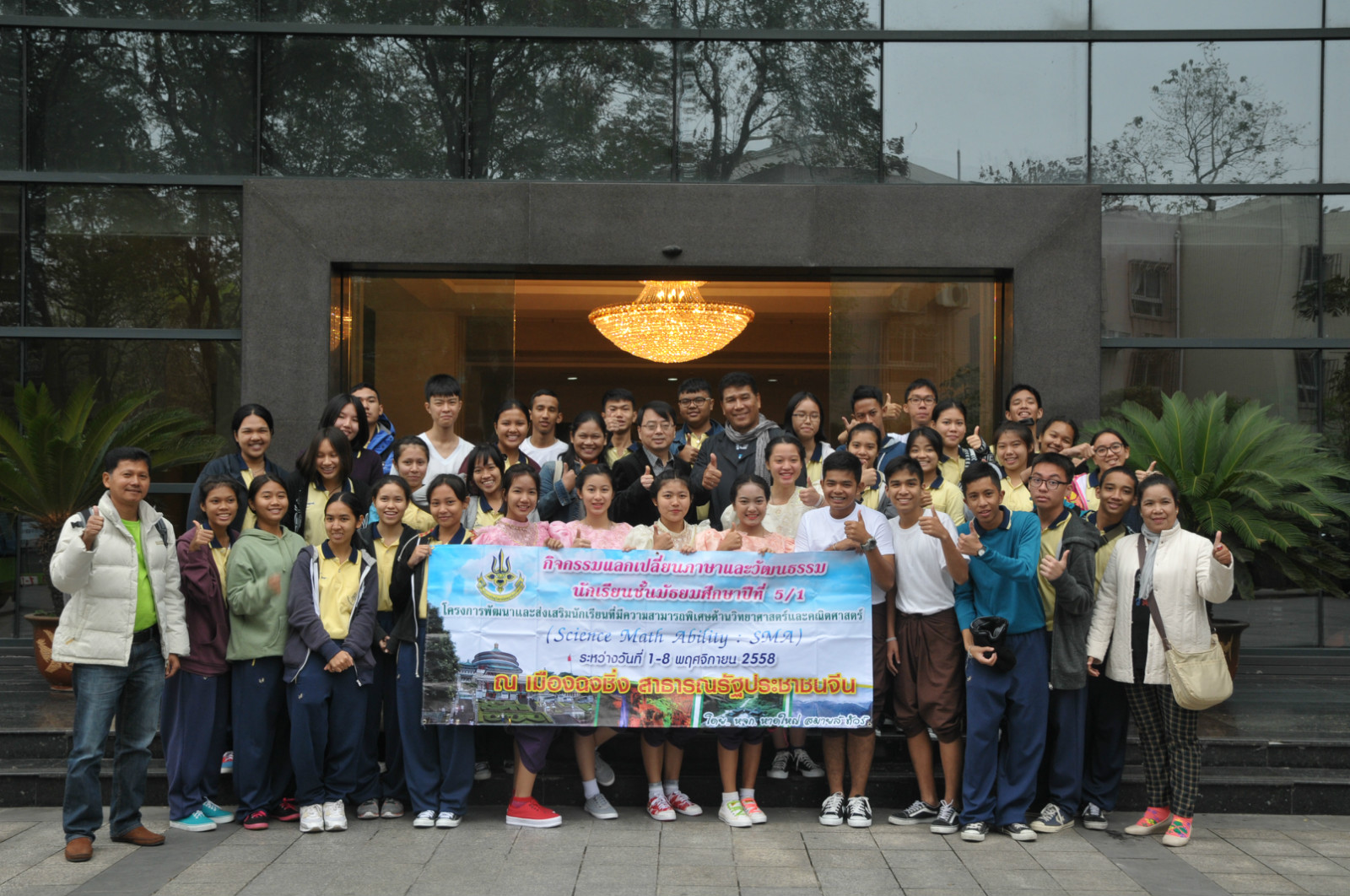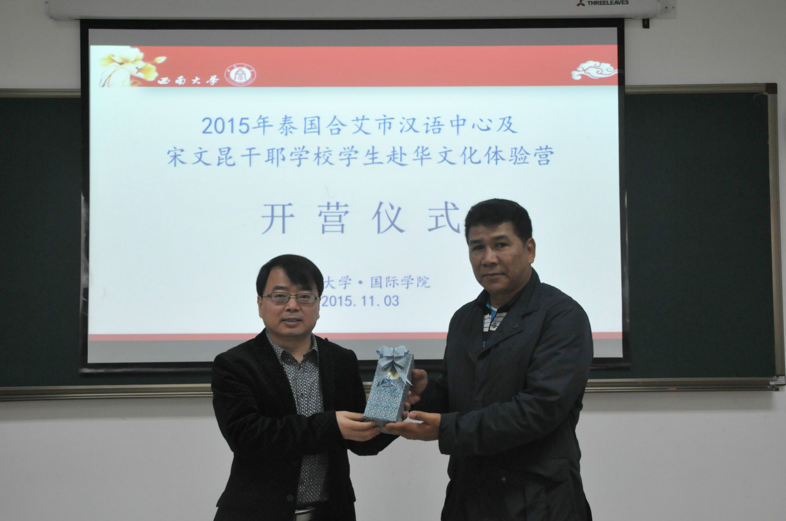 张家政副院长向泰国教师代表赠送纪念品,10名泰国学生表演了泰国传统节日——水灯节舞蹈,典礼在轻松愉快的氛围中结束。会后大家在紫云楼前合影留念,泰国团员们在语伴的陪同下乘观光车参观了校园。