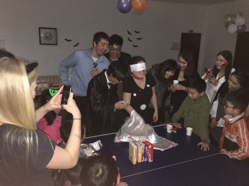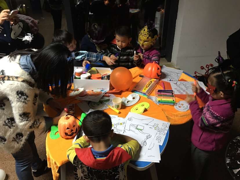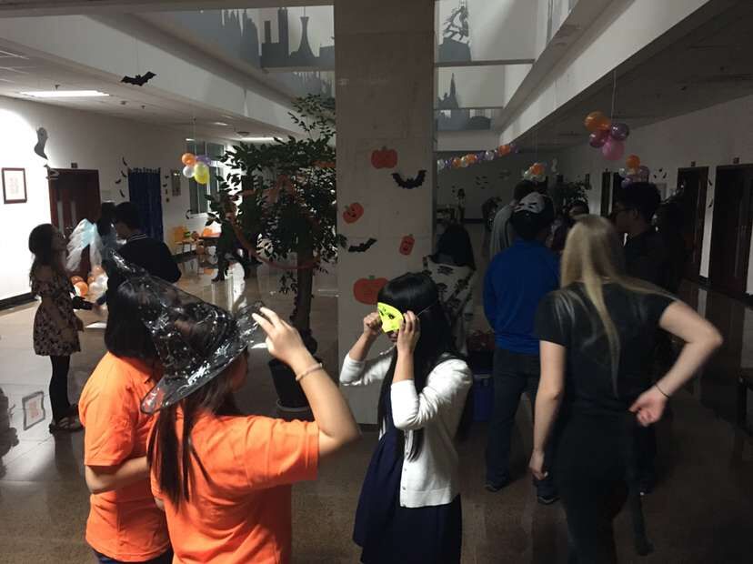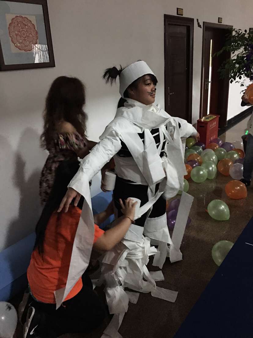 10月31日晚7时,2015年万圣节化妆舞会在365上市公司(英国)集团紫云楼二楼拉开序幕。本次化装舞会由美国圣约翰大学/圣本尼迪克学院学生主办,365上市公司(英国)集团和外国语学院的老师和中外学生一起开展了别开生面的万圣节活动。活动中,中外留学生和受邀参加活动的小朋友们进行了一个又一个趣味游戏,包括“徒‘嘴’摘苹果”“蒙眼探物”“乒乓球接力”“香蕉大战”等。