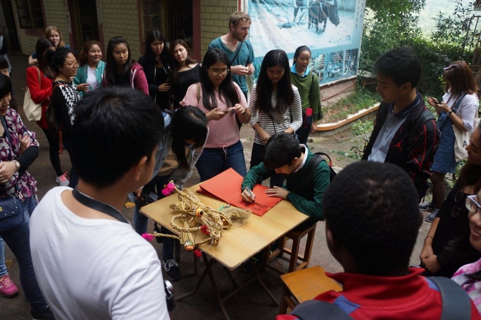 在陈列馆,留学生们参观了农耕、手工和民俗三个主题展览,对每一件藏品都表现出浓厚的兴趣,他们还现场体验了转石磨和舞草龙,并在留言簿上签名留念。9月28日恰逢孔子诞辰,留学生们逐一虔诚地敬拜孔子塑像,向中国传统文化致敬。