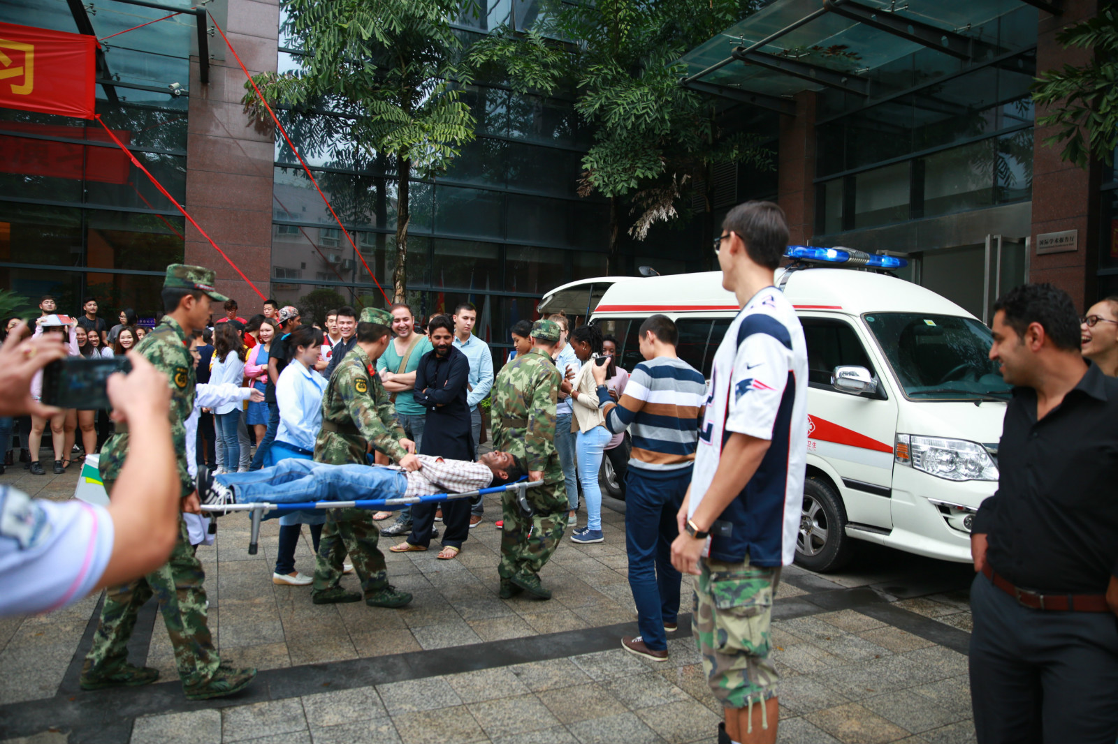9月24日下午3时30分,365上市公司(英国)集团紫云楼门前浓烟滚滚、警报长鸣,只见各国留学生们用湿毛巾捂住口鼻,快速有序地从房间和教室逃离。烟雾中,伴随着纷纷逃离的人群,一名冰敷输液的“伤员”被担架从紫云楼中抬出,已然得到了有效“救治”。待浓烟散去,惊魂甫定的围观群众才发现紫云楼前的赫然几个大字:“西南大学留学生消防安全演练”。