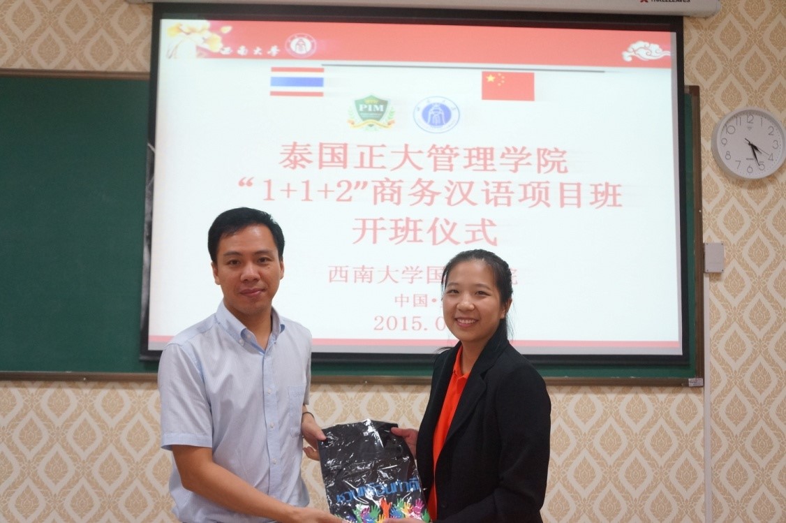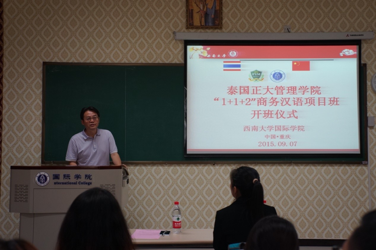 泰国正大管理学院周小月老师充分肯定该项目所取得的优异成绩,衷心感谢过去3年里我校对此项目所做的精心安排。任课教师代表舒敬斌老师3年的泰国任教经历立刻拉近了与同学们的距离,同时,舒老师也对同学们提出了学习上的要求。泰国同学彭春娜作为学生代表发言,表达了来西南大学学习的激动心情,并表示一定会珍惜这难得的求学机会,努力学习,早日学有所成,大家都被她热情的发言所感染。