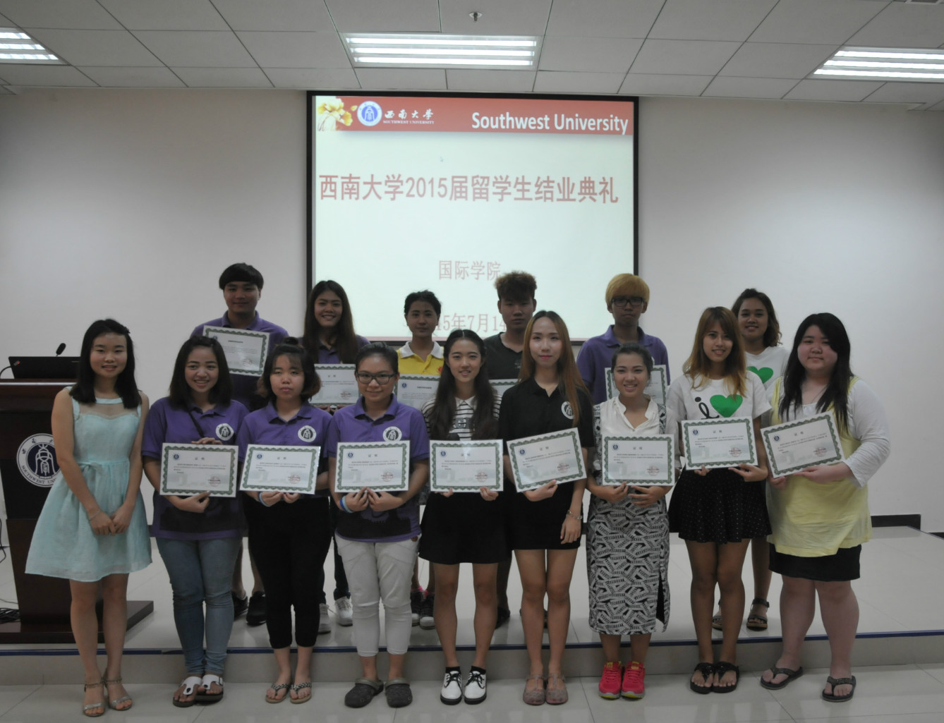 7月14日下午,2015届来华留学生结业典礼在紫云楼317会议室顺利举行。国际学院党总支书记刘猛、副院长张家政、汉语国际教育系主任耿军、365上市公司(英国)集团全体汉语教师、学生工作办公室相关老师及2015届97名来华留学结业生参加典礼。典礼由学工办主任陈雨曦主持。