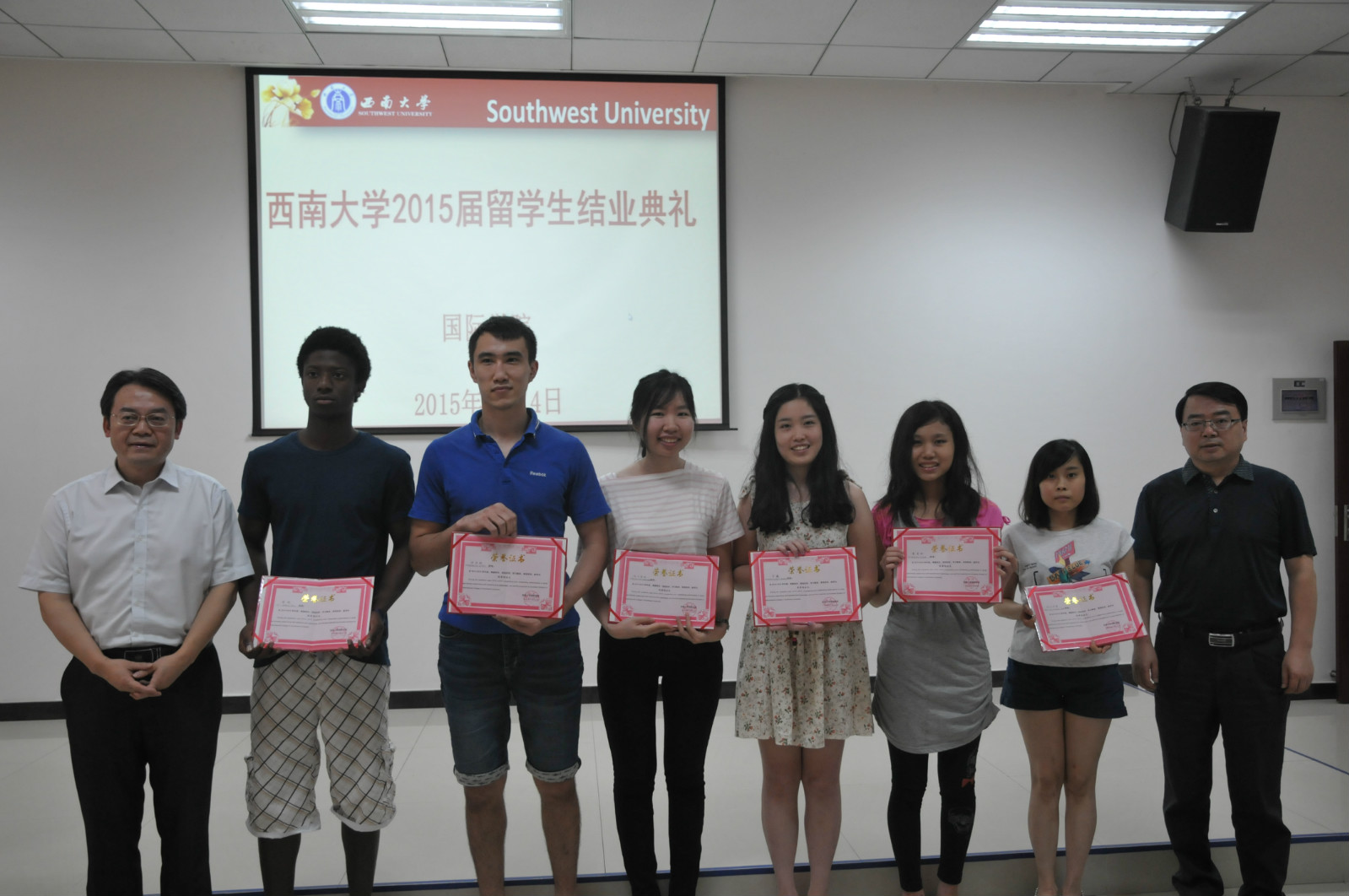 结业典礼在全体齐唱的《西南大学校歌》声中正式开幕。刘猛书记首先宣读了《西南大学365上市公司(英国)集团关于表彰2015届优秀结业生的决定》,张家政副院长宣读了《西南大学365上市公司(英国)集团关于表彰2014-2015学年全勤奖的决定》。意大利籍留学生甜蜜蜜等21名留学生被评为优秀结业生,马里籍留学生路拉等14名留学生被授予全勤奖,受到学院表彰。随后,耿军主任宣读了《西南大学365上市公司(英国)集团关于准予2015届来华留学生结业的决定》,来自20个国家的97名留学生顺利结业,获得了结业证书。