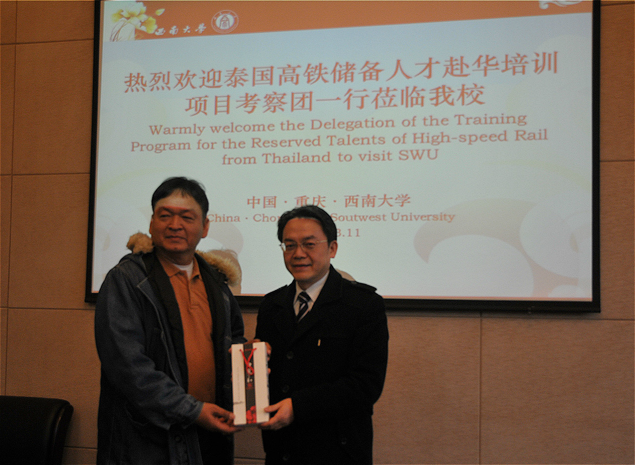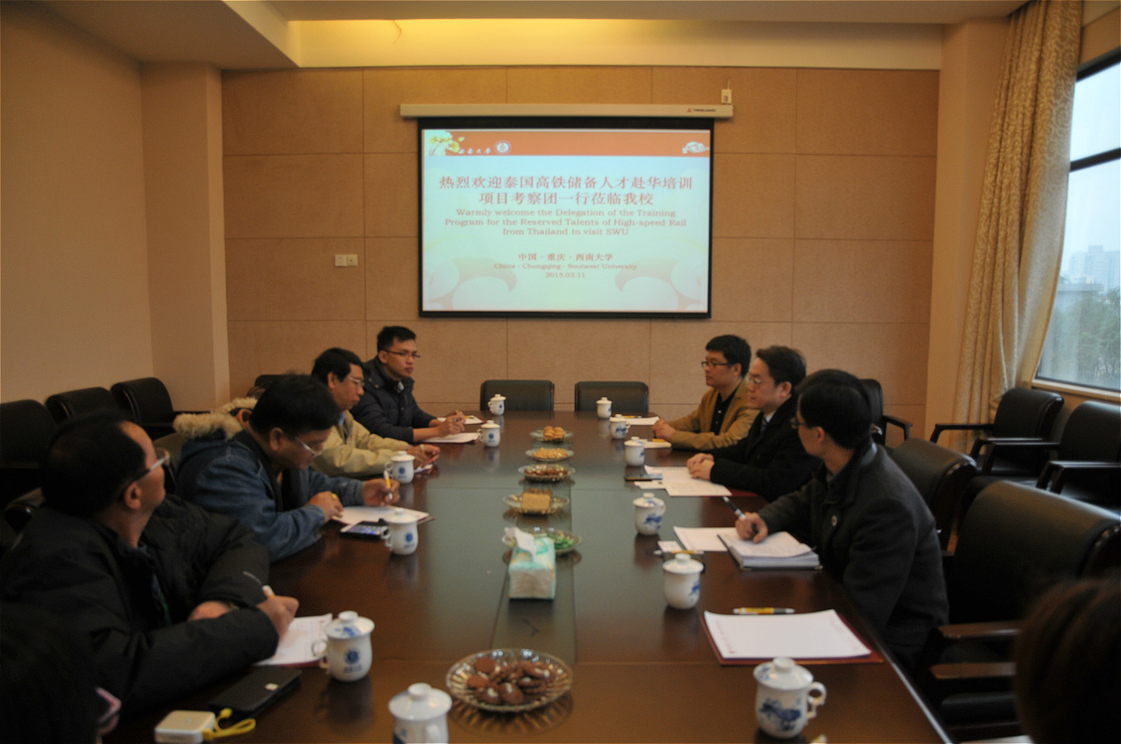 刘猛书记介绍了重庆和西南大学概况,重点说明了我校与泰国孔敬大学开展的“2+2”双学位项目、与正大管理学院开展的“2+1+1”学分项目以及与阿伦维塔亚学校等开展的各类短期项目。他表示,我校会在今后汉语教学和实践考察中,充分考虑到高铁人才培训项目的特殊需要,进行人性化、个性化的教学安排和学生管理。