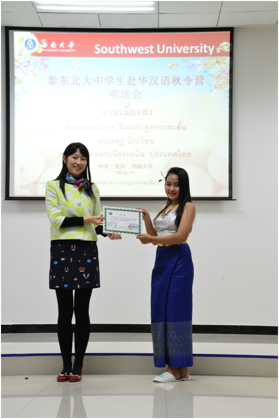 随后泰国同学们表演了节目《中文歌曲——老鼠爱大米》、《泰国风情——泰国四部舞蹈》、《现代广场舞——小苹果》,在展现泰国文化和青春个性的同时也表达了对西南大学和对重庆的依依不舍之情。最后,王院长和陈主任分别为师生们颁发了结业证书,欢送会在活泼热烈的氛围中圆满结束。