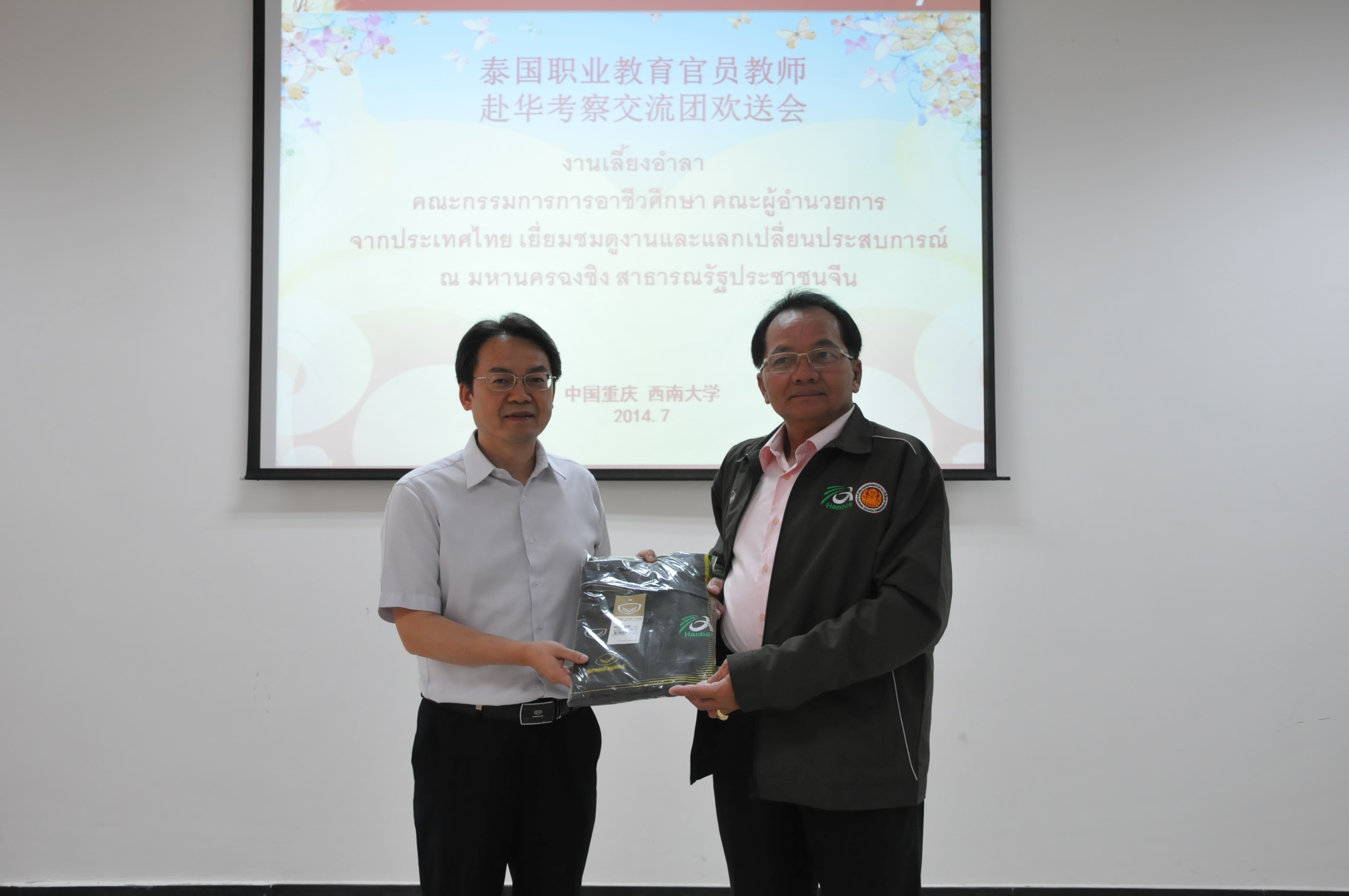 刘猛书记致欢送词。首先祝贺各位团员圆满完成在重庆的交流考察任务,感谢大家对学院工作的理解与支持。期待有更多泰国职业技术教育学院的师生来到西南大学进修学习。祝愿泰国客人身体健康,心情愉快,返程顺利。