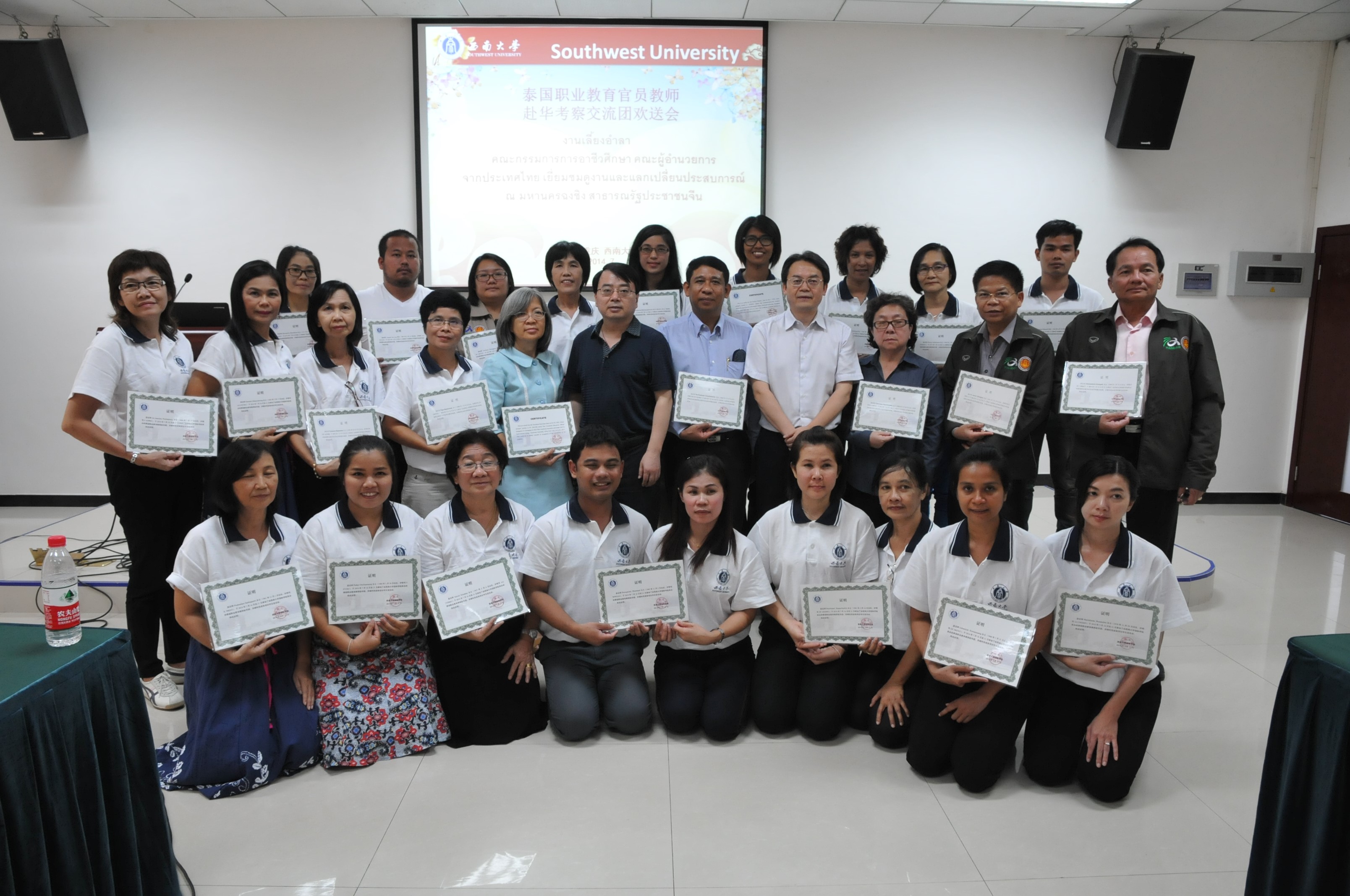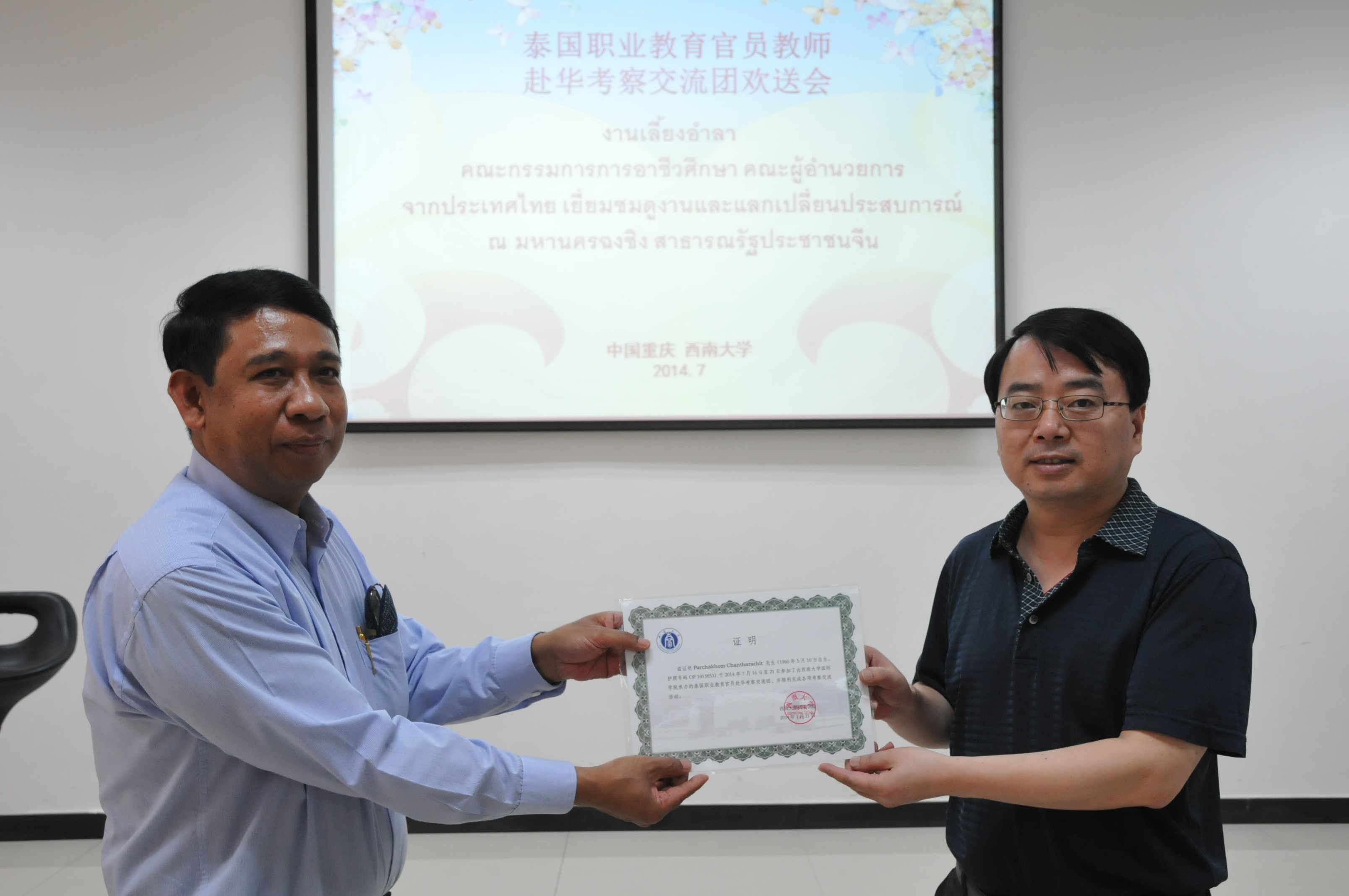刘猛书记和张家政副院长向泰方考察团成员颁发结业证书并合影留念。至此,2014年泰国职业教育委员会校长暨教师赴华考察交流团活动画上圆满句号。