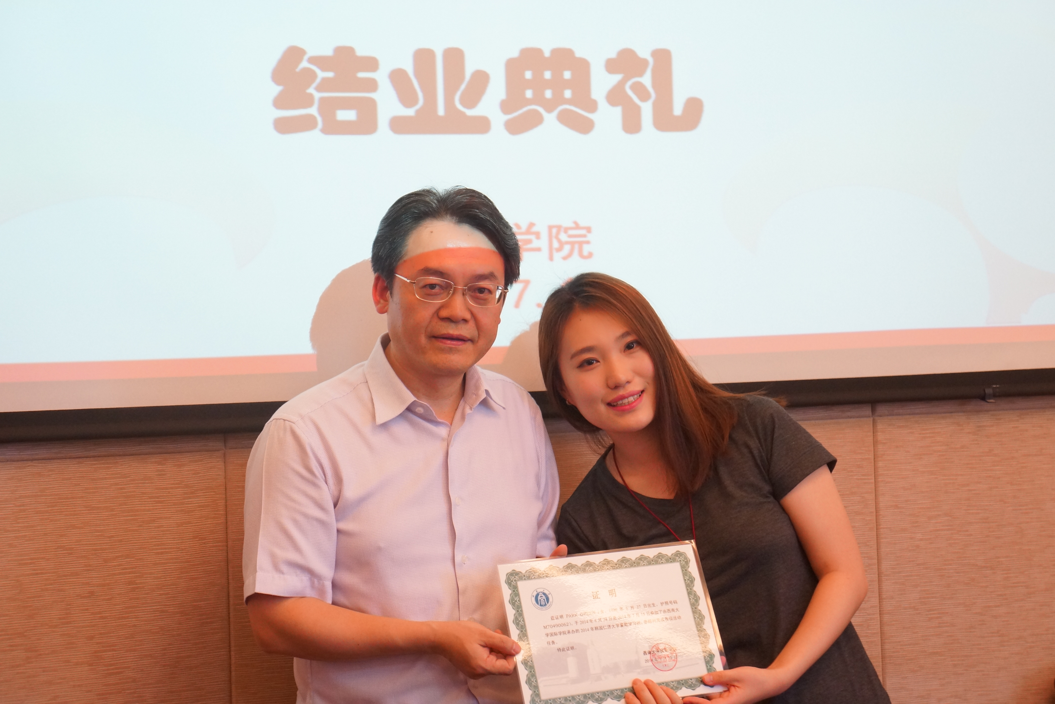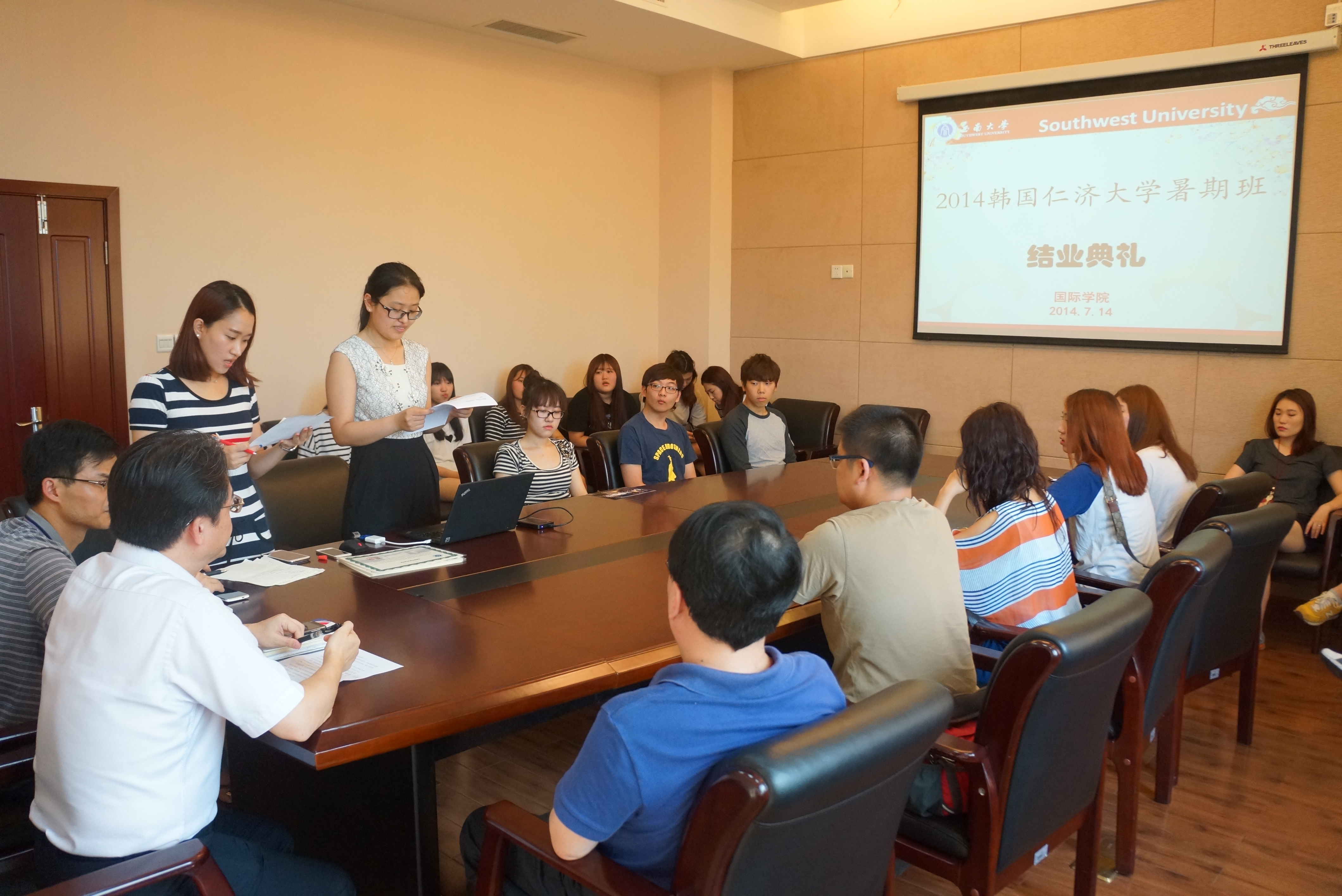 7月14日下午,2014年韩国仁济大学暑期班结业典礼在365上市公司(英国)集团310会议室隆重召开。学院党总支书记兼副院长刘猛、副院长张家政、招生办公室主任代远鸿、各位任课老师,19名来自韩国仁济大学的学生及中国语伴代表参加典礼。