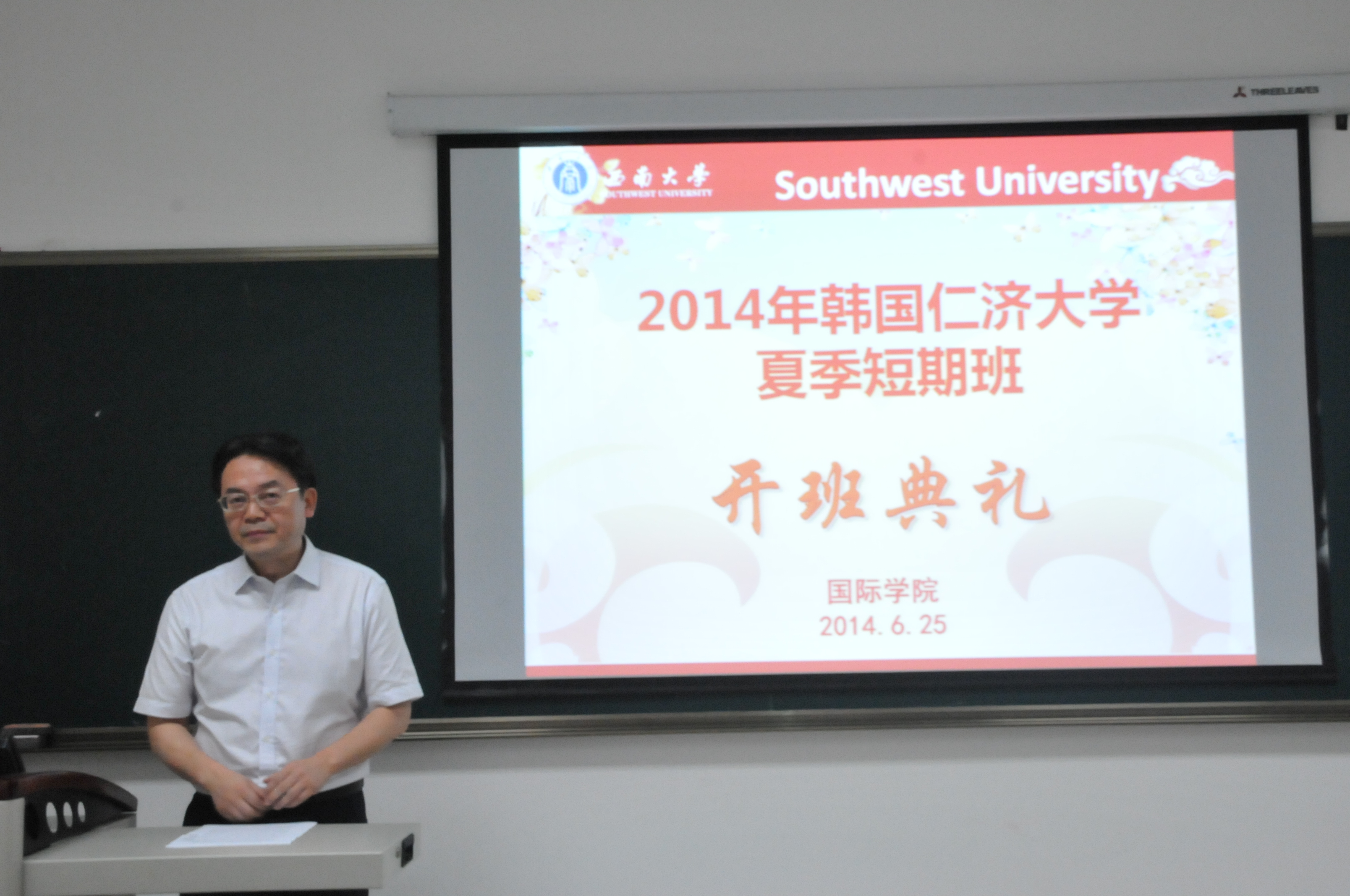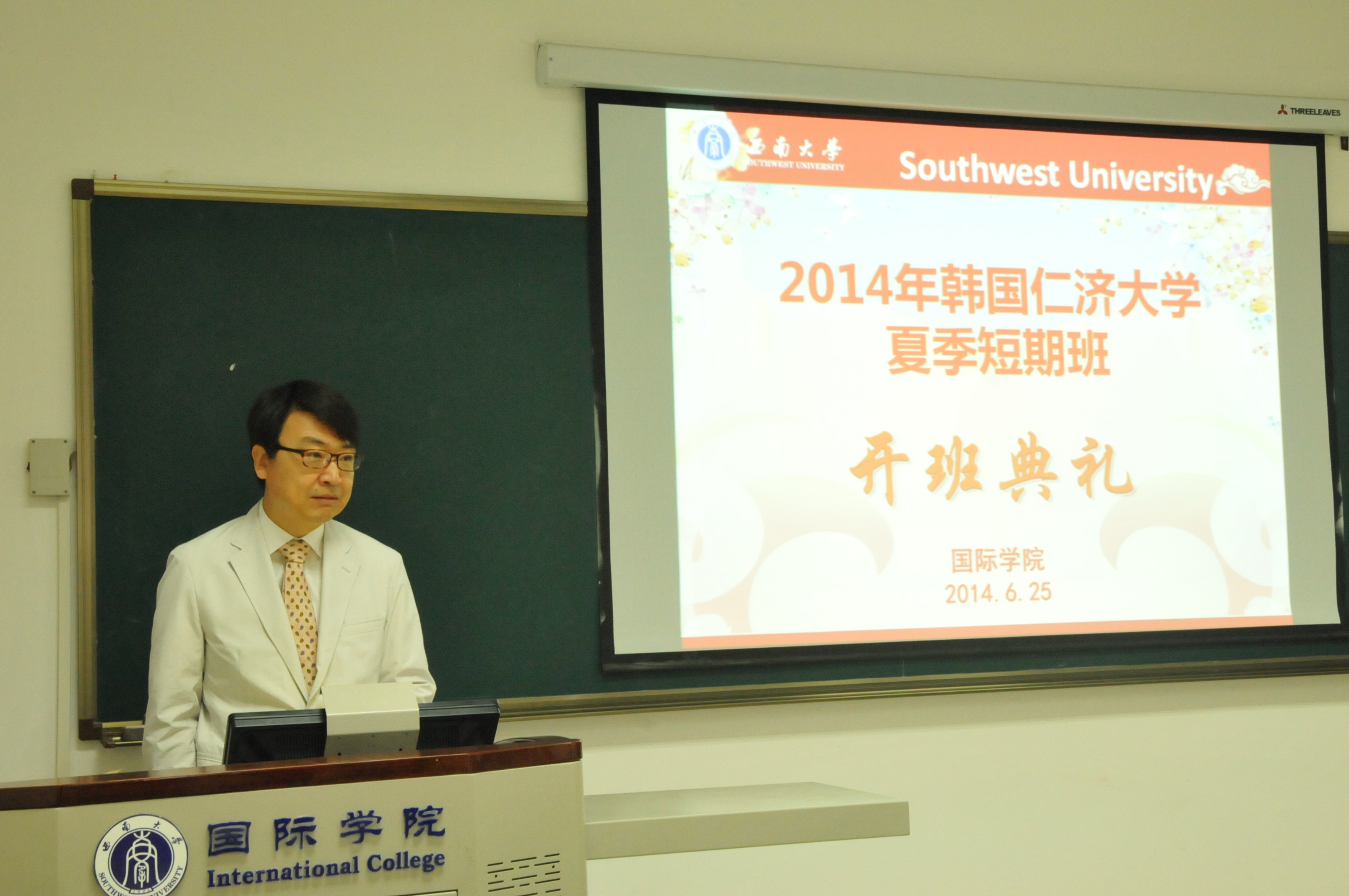 韩国仁济大学国际交流处处长朴载燮讲话,他表达了对西南大学与仁济大学建立合作项目的信心,同时对参加项目的韩国学生提出了殷切的期望,