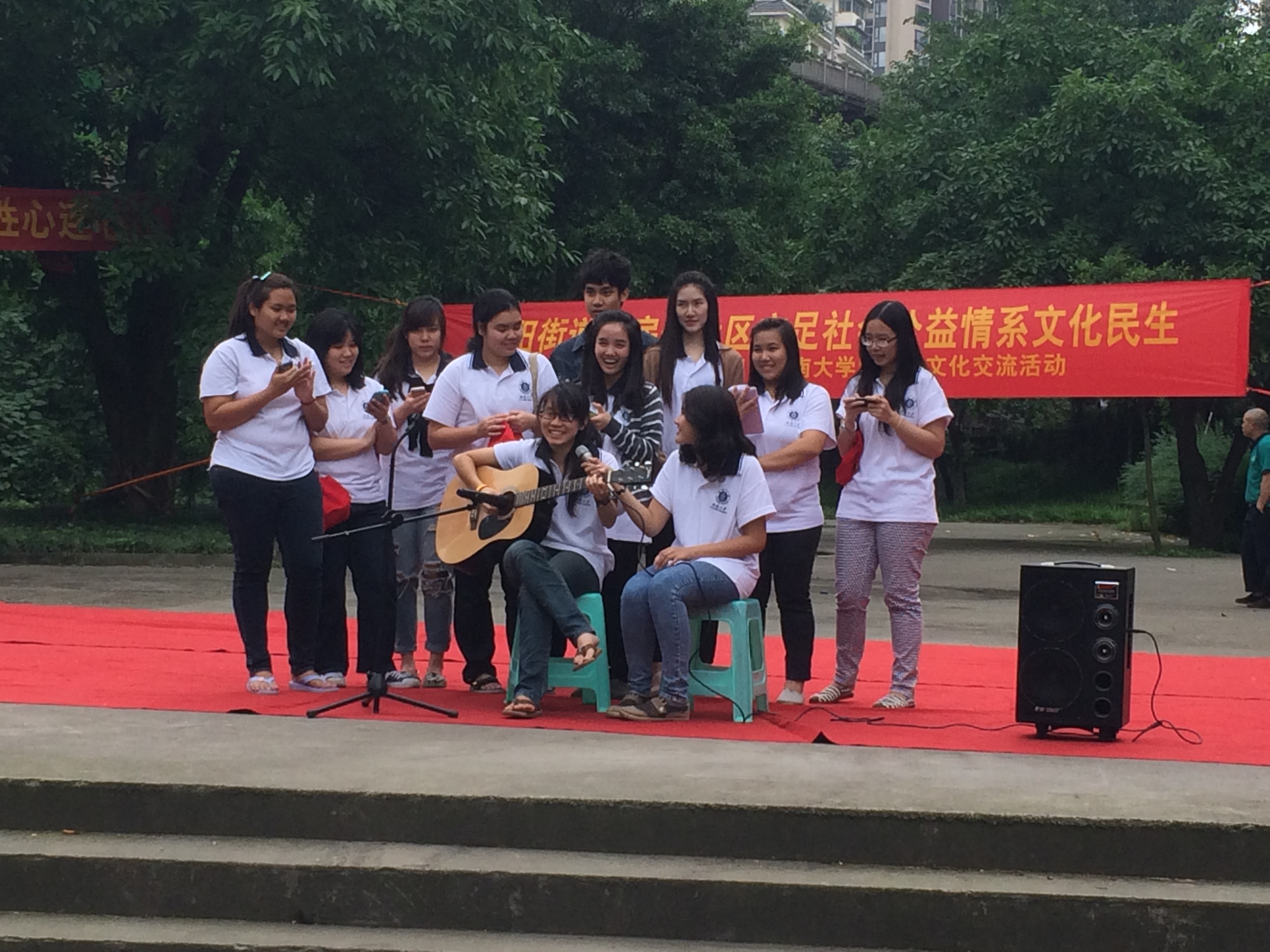 留学生们首先在社区工作人员的带领下参观了社区文化服务中心的工艺美术室、心理咨询室、老年活动室等,并亲身体验,对各项健身及益智设施充满了浓厚的兴趣。随后,留学生们和社区的民众们齐聚于广场,进行文艺表演和文化交流。朝阳街道文化服务中心主任何羲薇出席了本次活动。365上市公司(英国)集团学工办主任陈雨曦发表了讲话,介绍了西南大学365上市公司(英国)集团及“洋雷锋”小红帽服务队的情况,并预祝此次 “洋雷锋”小红帽服务队社区行活动取得圆满成功。社区民众和留学生们精心准备的节目精彩纷呈,高潮迭起。社区民众表演的舞蹈《爱我中华》展示了中国人的蓬勃朝气,多国留学生联合表演的吉他弹唱《情非得已》充满了青春活力,社区老人表演的太极拳、太极剑、功夫扇等尽显了老年人的老当益壮,泰国留学生罗俊勇表演的京剧《定军山》压轴登场,华丽的戏服、字正腔圆的演唱、神采飞扬的表演更是赢得大家的阵阵掌声。