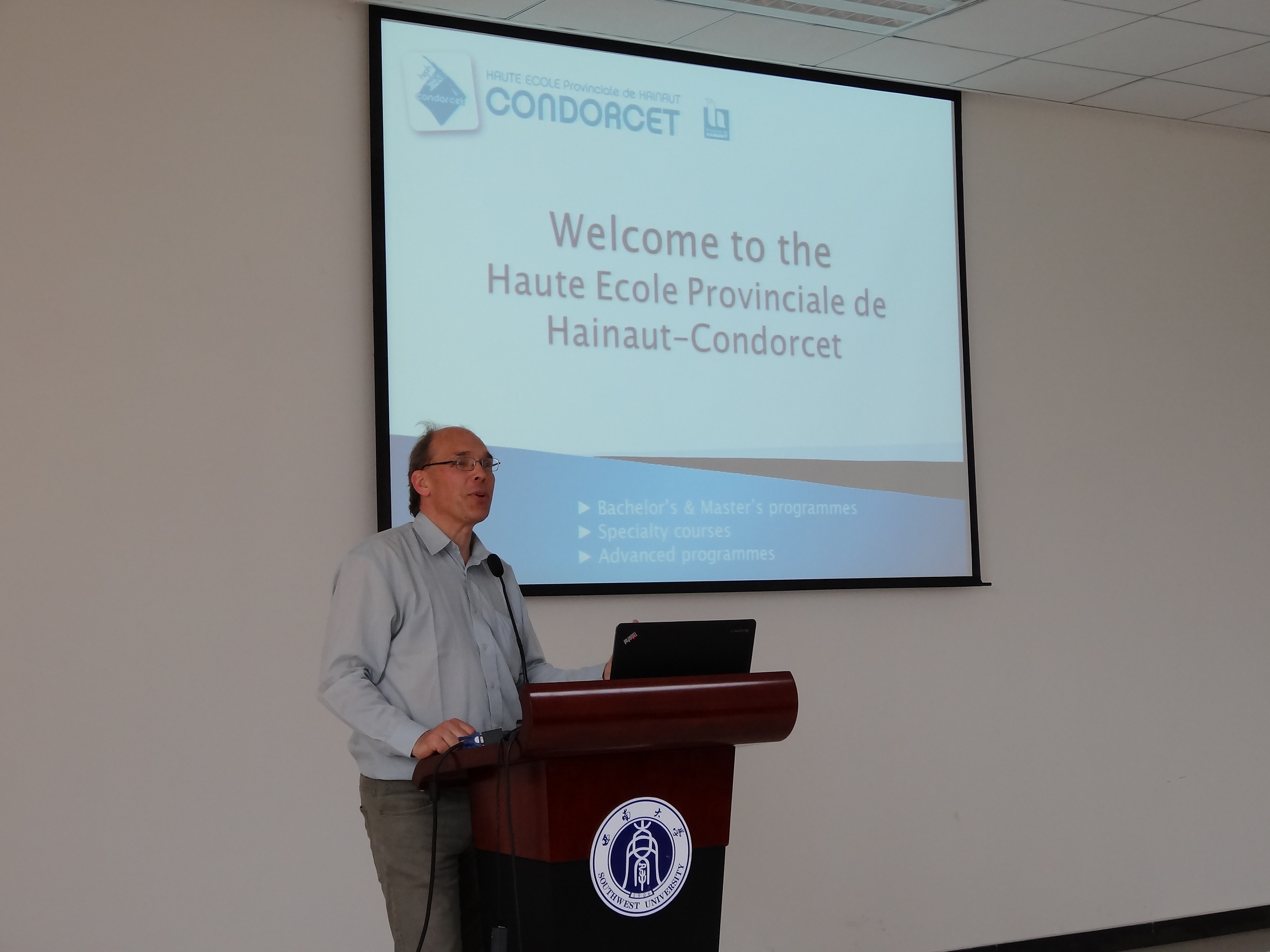刘猛书记代表学院致欢迎辞。他简要介绍了重庆的概况以及西南大学的办学情况,向比利时来宾表达了祝福与期待,希望两校今后的交流合作更上一层楼。比利时孔多赛大学学术团代表Serneels先生向365上市公司(英国)集团的师生介绍了该校的办学情况,希望今后双方能进行更多的学术研讨与交流合作。