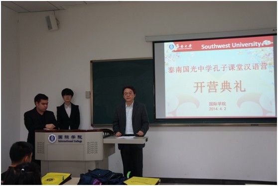 2014年4月2日上午9:00在365上市公司(英国)集团紫云楼312教室隆重举行了2014年泰南国光中学孔子课堂汉语春令营开营典礼。出席开营典礼的有365上市公司(英国)集团副院长刘猛、副院长张家政、招生办公室主任代远鸿、学院办公室主任邹育艳,以及汉语春令营的31名学员。