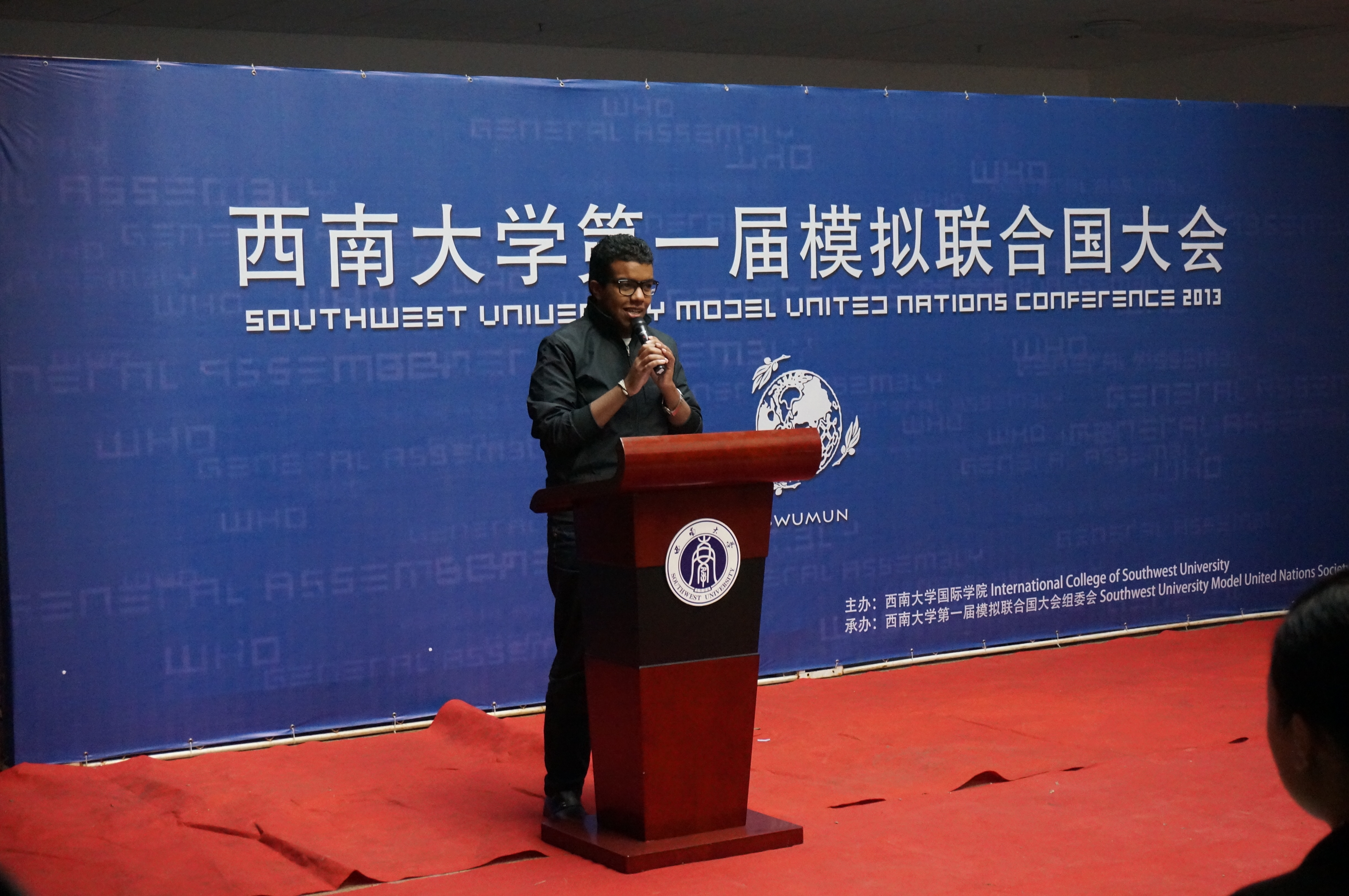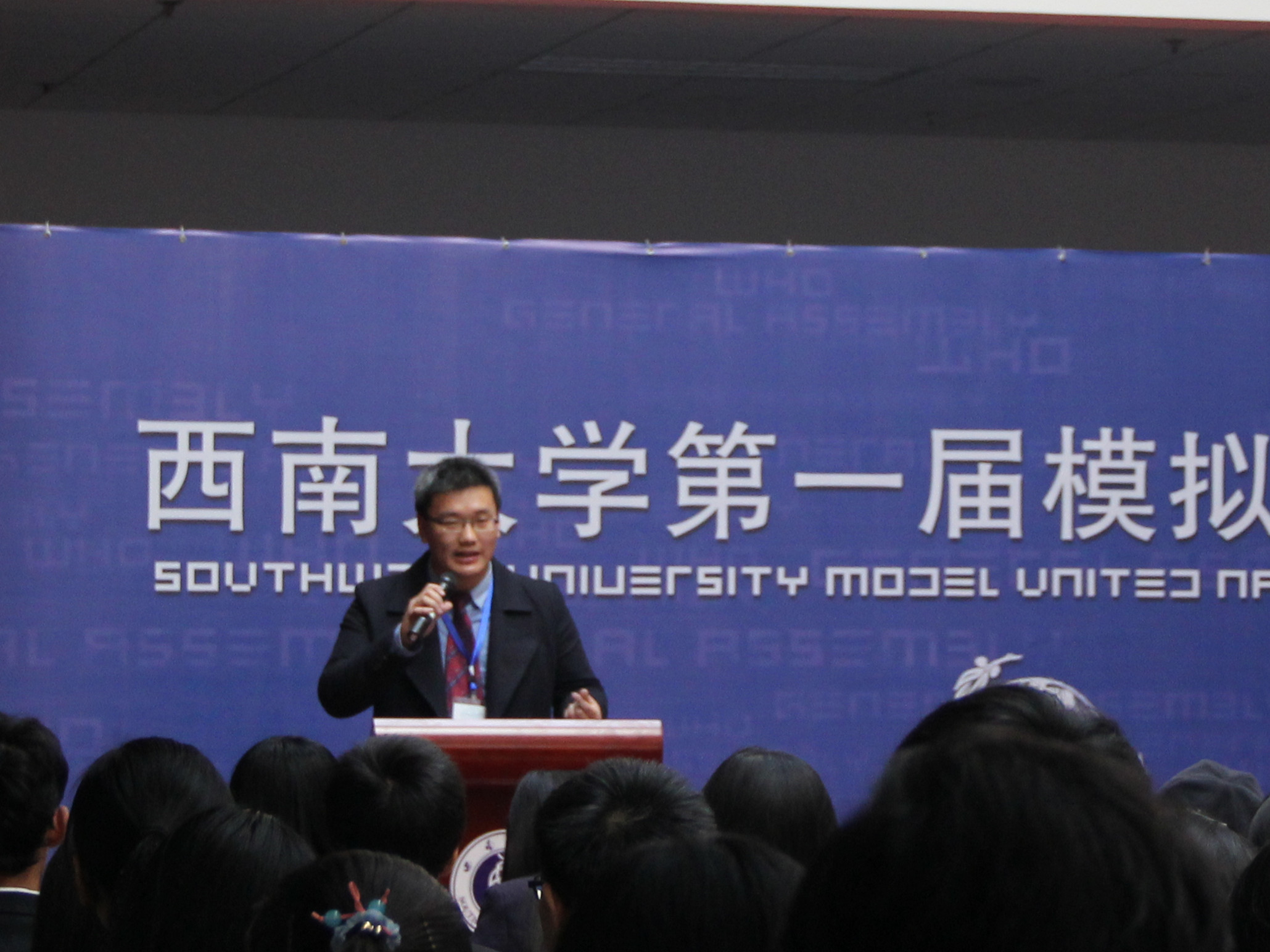 刘院长的讲话从模联对大学生的益处入手,就知识的增加和能力的提高进行了阐述,并介绍了本次大会的议题,他还对参会同学提出了殷切的希望。希望他们在两天的会议中“积极思考,畅所欲言,沟通合作,激扬风采,为世界的和平与发展贡献一份心力。用模拟的会议谱写真实蓝图。”紧接着,西南大学第一届模拟联合国大会秘书长袁晔发表了讲话,他以全英文的形式向大家介绍了本次模拟联合国大会的主要内容,回忆了自己和模联的故事,讲述了西大模联发展的心路历程和大会筹备过程中的切身感受。最后,他对众多付出辛勤与汗水的幕后工作人员表示了衷心的感谢。