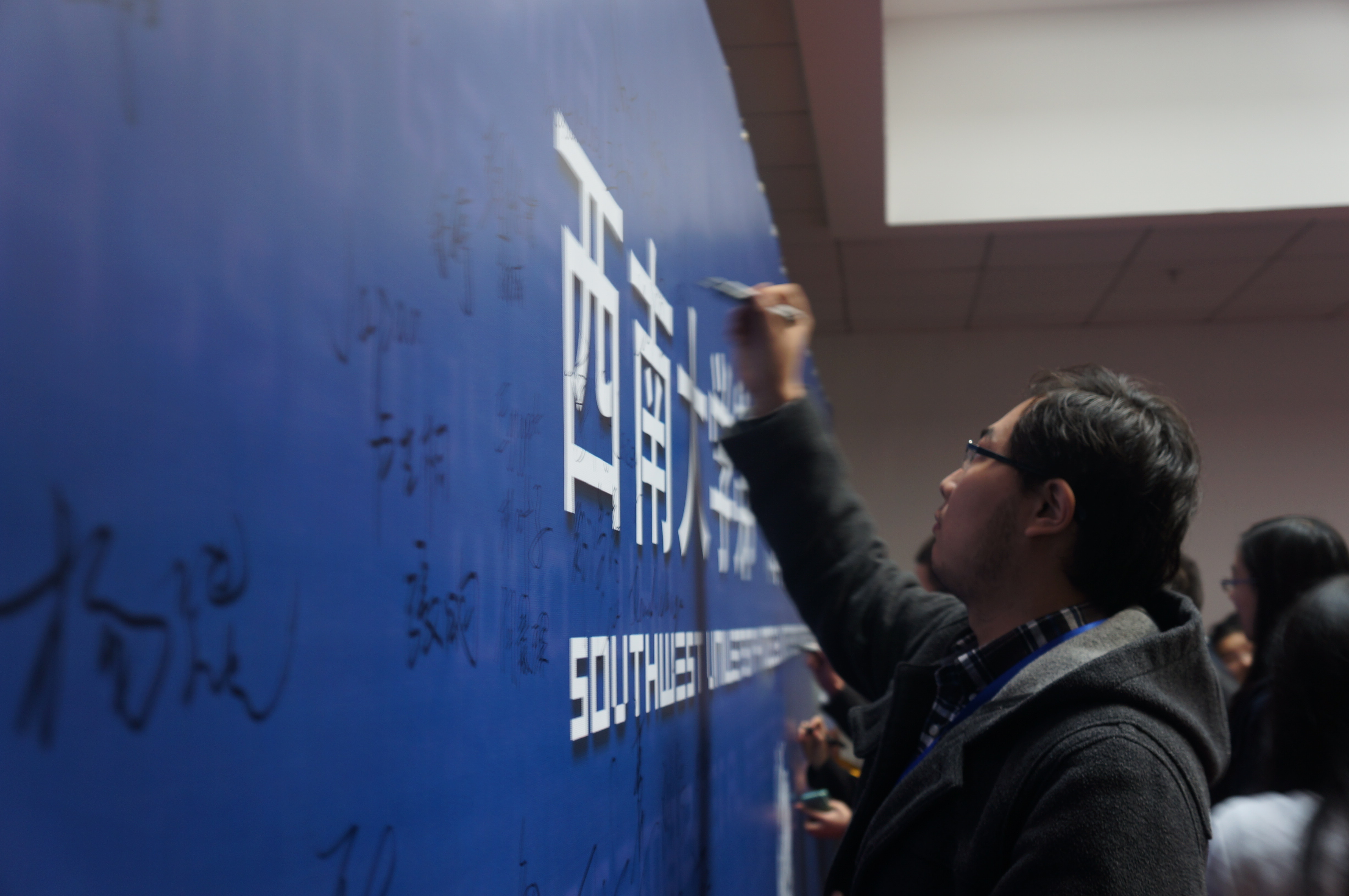 活动的最后,由刘院长带头,与会嘉宾和全体成员在签名墙上写下了自己对西南大学第一届模拟联合国大会的祝福,将本次开幕式推向了高潮。在美妙的音乐声中,开幕式圆满结束。