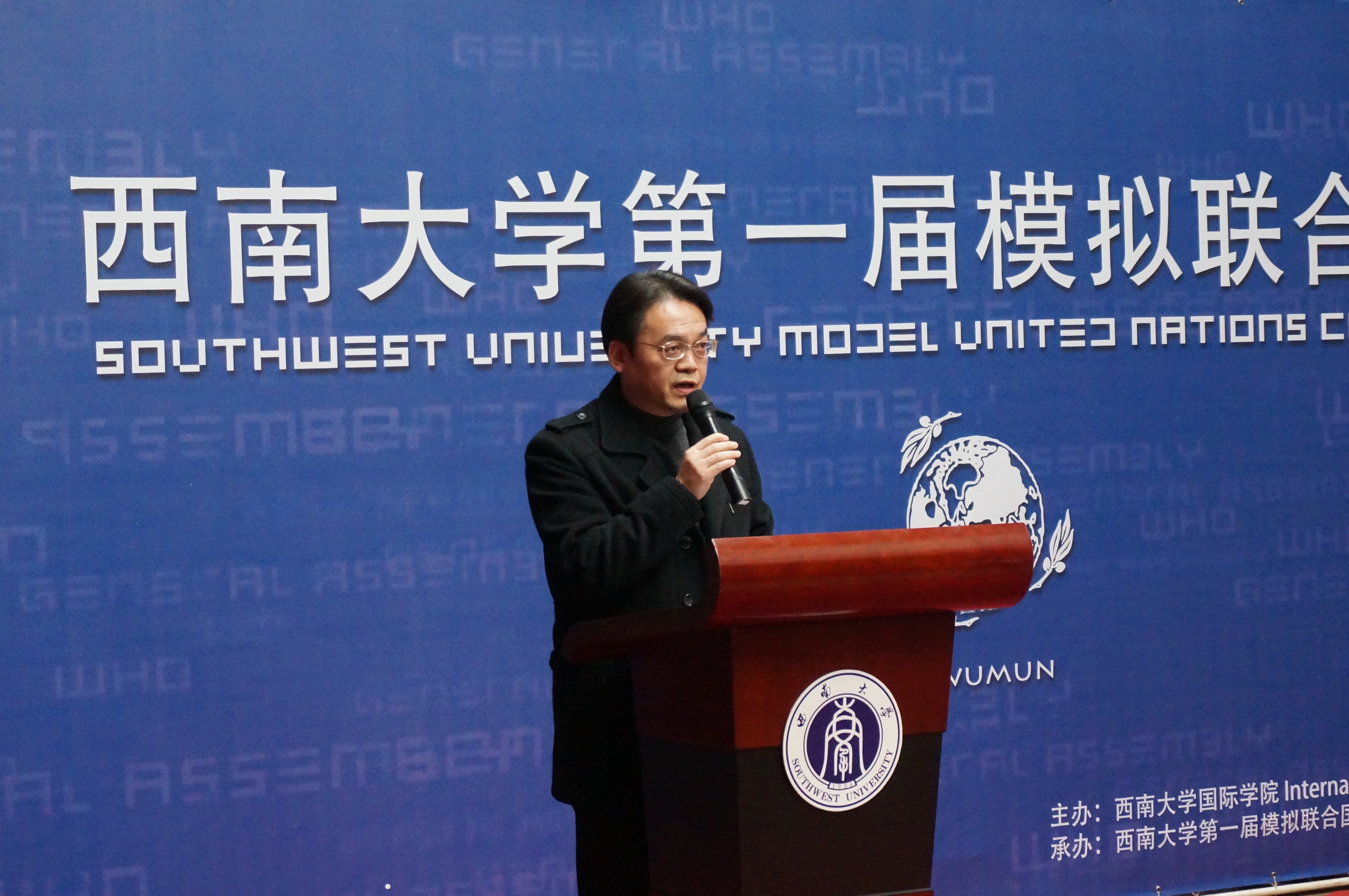 首先,刘院长发表了开幕致辞,表达了对我校模联活动的大力支持和对本届大会的期许。此后,西南大学第一届模拟联合国大会秘书长袁晔、留学生代表黄阿里、英文委员会、中文委员会及新闻司负责人分别致辞。
