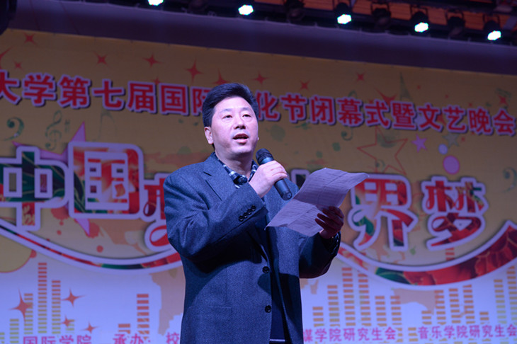 闭幕式在一曲清新婉约的扇子舞《茉莉花》中拉开帷幕,靳校长首先上台致辞。他说道,在为期一周的国际文化节中,通过举办国际文化论坛、趣味体育比赛、各国文化展、留学生摄影、剪纸和书法作品展、各国美食品尝等活动,为初冬的校园平添了几分生动与鲜活,让埋头苦读的同学们感受到世界的召唤,更拉近了中外学生的友谊。他希望国际文化节能够成为西南大学的传统,一年一年传承下去,生生不息,成为留学生了解中国、中国学生放眼世界的广阔平台。最后,靳校长祝贺本届国际文化节成功闭幕。