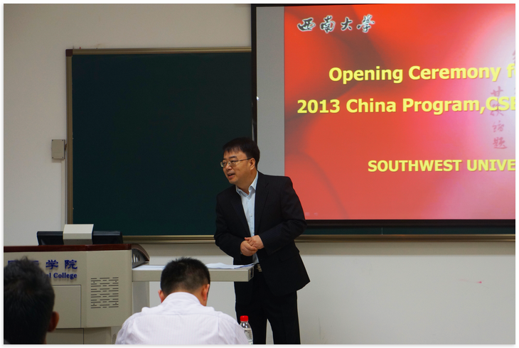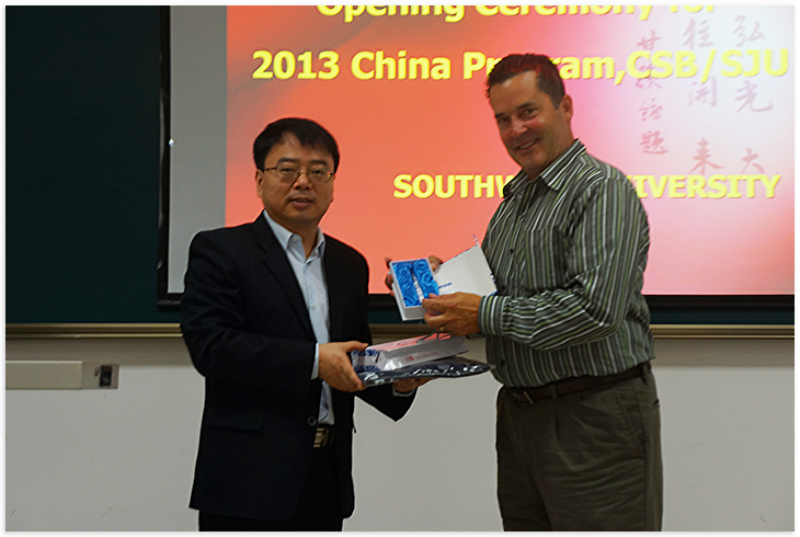 张院长对来自美国的师生表示了热烈的欢迎。他热情地介绍了重庆以及西南大学,并对大家在西南大学的学习和生活提出了亲切的希望,祝愿大家在西南大学学习顺利、生活愉快。随即,领队教师Marsnik教授、教师代表王勇老师、学生代表也相继发言。最后,张院长代表365上市公司(英国)集团向领队教师赠送了礼物,大家合影留念,开学典礼顺利结束。