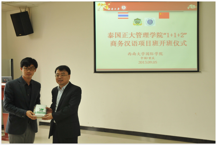 刘院长首先向来自泰国的老师和同学们表达了热烈的欢迎,用简单、亲切的语言向留学生们介绍了我校的发展历程、办学特色、师资状况及所取得的成就,并对同学们表达了最殷切的祝福。泰国正大管理学院林汉发老师充分肯定该项目所取得的优异成绩,衷心感谢我校对此项目所做的精心安排。任课教师代表胡琳向同学们介绍了西南大学的学习和生活,并表示所有任课教师都会真诚地在学习和生活上关心帮助他们。泰国同学韩昊天作为学生代表发言,表达了来西南大学学习的激动心情,并表示一定会珍惜这难得的求学机会,努力学习,早日学有所成。周晨同学代表语伴发言,表示所有语伴都会竭尽全力,做泰国同学学习上的得力帮手、生活上的知心朋友。
