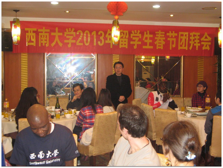 春节是中国的传统节日,为了让来自世界各国的留学生了解中国的传统文化,度过一个温馨祥和的节日, 2月5日2013年西南大学留学生春节团拜会在桂园宾馆举行。
