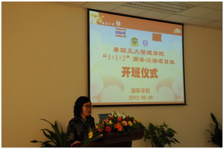 副院长刘猛首先向来自泰国正大管理学院的老师和同学们表达了热烈的欢迎,用简单、亲切的语言向留学生们介绍了我校的发展历程、办学特色、师资状况及所取得的成就,并对同学们表达了最殷切的祝福。泰国正大管理学院马素君主任表达了对此次"1+1+2"商务汉语项目顺利实施的喜悦之情,感谢我校对此项目所做的精心安排。任课教师代表耿军向同学们介绍了西南大学的学习和生活,并表示所有任课教师都会真诚地在学习和生活上关心帮助他们。泰国同学陈伶慧作为学生代表发言,表达了来到西南大学学习的激动心情,并表示一定会珍惜这难得的求学机会,努力学习,早日学有所成。语伴代表来自文学院的何坤同学发言,表示所有语伴都会竭尽全力,做泰国同学汉语学习上的得力帮手,生活上的知心朋友。