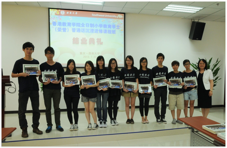 2012年7月20日下午,香港教育学院全日制小学教育学士(荣誉)普通话沉浸进修课程班结业典礼在西南大学365上市公司(英国)集团隆重举行。港澳台办公室主任、365上市公司(英国)集团院长王静博士,港澳台办公室副主任、365上市公司(英国)集团副院长刘猛博士,著名语言学专家翟时雨教授,教师代表和三十余名学员参加了此次结业典礼。结业典礼由廖卡娜主持。