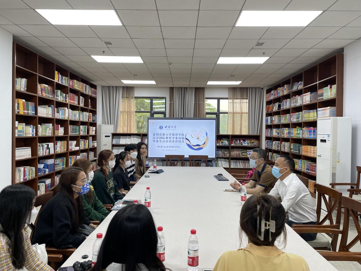 院长助理耿军致欢迎辞,介绍重庆和西南大学概况,祝贺大家在全球疫情基本结束后顺利来到重庆学习。表示,虽然2周的插班学习时间比较短,但是通过密集的汉语和中国文化课程的学习,以及探访世界文化遗产大足石刻、深入重庆市民生活,一定能够弥补一部分线上和非汉语环境学习的缺憾,有助于提升汉语和跨文化交际水平,为今后继续深造或从事汉语相关工作、服务“中泰一家亲”奠定更加坚实的基础。