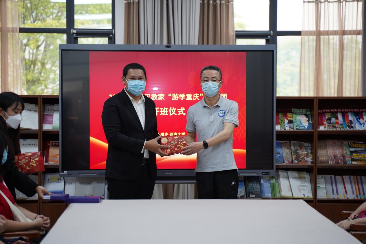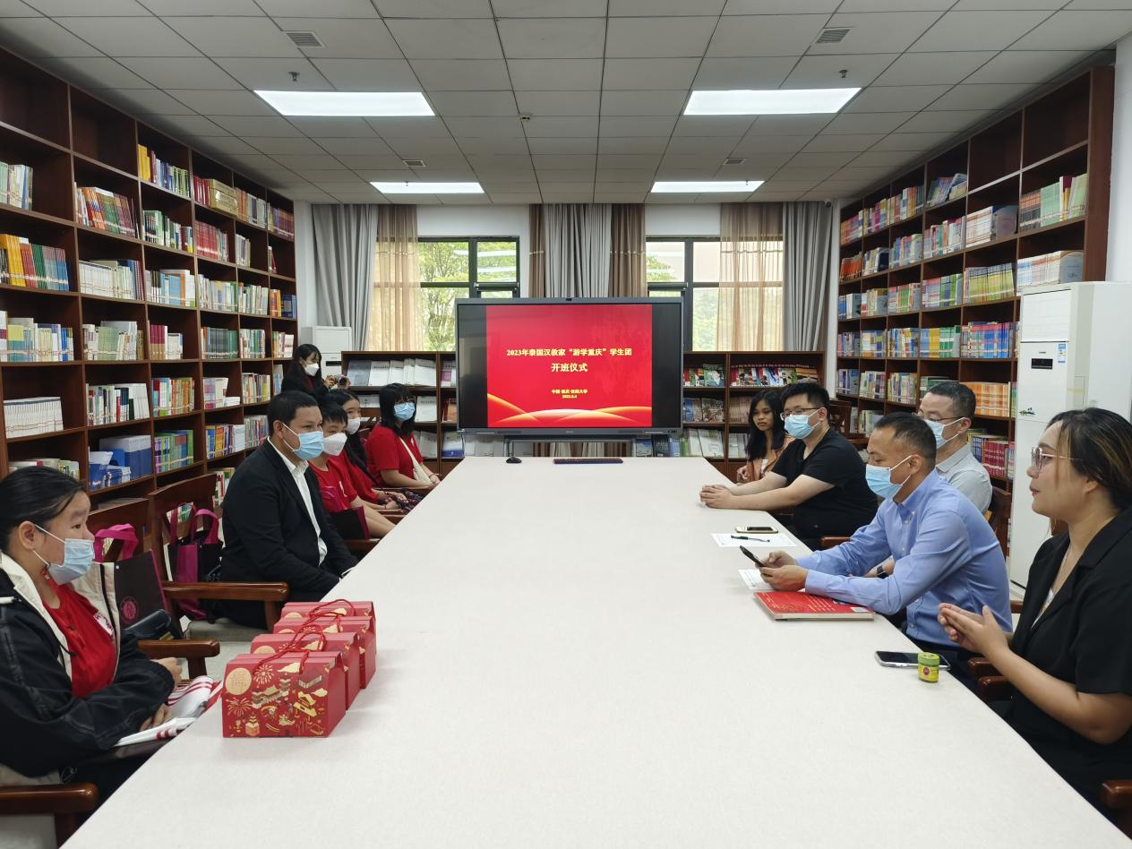 5月4日上午9点30分,泰国汉教家“游学重庆”学生团开班仪式在学院紫云楼图书馆(316室)顺利举行,副院长李航、院长助理耿军、国际学生招生办公室主任黄无为,汉教家有限公司负责人NANSATHIT JAKRAPAN、领队教师于兰凤以及10名泰国中学生参加仪式。