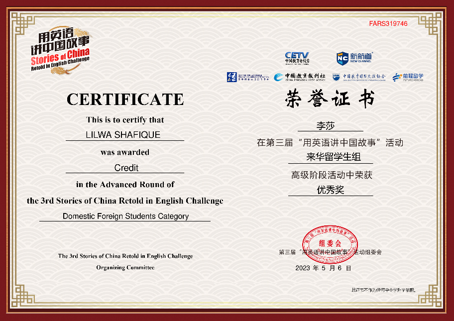 近日,第三届“用英语讲中国故事”来华留学生组高级阶段比赛已圆满结束,经过激烈角逐,学校巴基斯坦籍LILWA SHAFIQUE(李莎)同学最终荣获“优秀奖”。