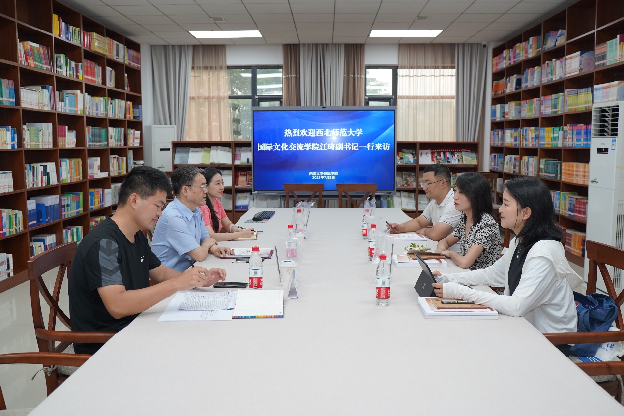 7月3日下午,西北师范大学国际文化交流学院党委副书记江琦一行3人来学院访问,就推进“三全育人”格局下的来华留学生国情教育、国际学生日常管理和服务工作典型举措、来华留学生管理系统信息化,以及国际学生创新创业与社团管理等问题展开深入交流。学院党委书记刘猛,学工办主任杨昆、辅导员汪鑫阳参加座谈会,会议由刘猛书记主持。